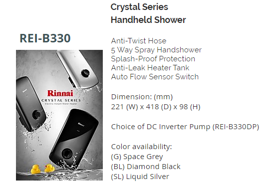 RINNAI REI-B330NPR BLACK/WHITE/GREY INSTANT HEATER WITH RAINSHOWER SET
