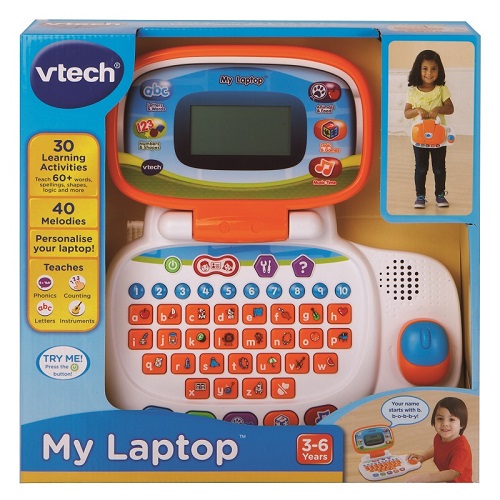ThisMy Laptop by VTech is an ideal pre-school laptop. The VTech My Laptop helpsteach early computer skills and uses age appropriate curriculum includingphonics, counting and spelling. It comes with an easy to use, child-friendly,4-directional mouse and 30 fun and educational activities.VTech My Laptopfeatures 5 progressive learning categories Letters & Words, Numbers &Shapes, Animals & Foods, Logic & Games and Music Time.You can alsopersonalize your child’s experience. Easily enter their name, age and favouritefood in the All About Me Mode. Little ones will love their personalized VTechMy Laptop.Create a personal avatar, choose a screen wallpaper and opening tune!Friendly penguin character leads and encourages play as a helper and friend.TheVTech My Laptop encourages logical thinking, visualisation skills and hand-