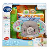 The Peek & Play Baby Book™ by VTech® is a real page turner! The soft book pages introduce adorable animals through bold pictures and fun interactive features. The cover has a cute elephant with crinkly ears, and each page plays sing-along songs, sound and phrases. Lift the fabric flaps on the pages for fun peek-a-boo surprises. Press the three fabric buttons to meet friendly characters and learn about animals, colors, objects and play songs. Take the infant book on the go and attach it to car carriers and more using the plastic ring. It’s the perfect first book for your baby!