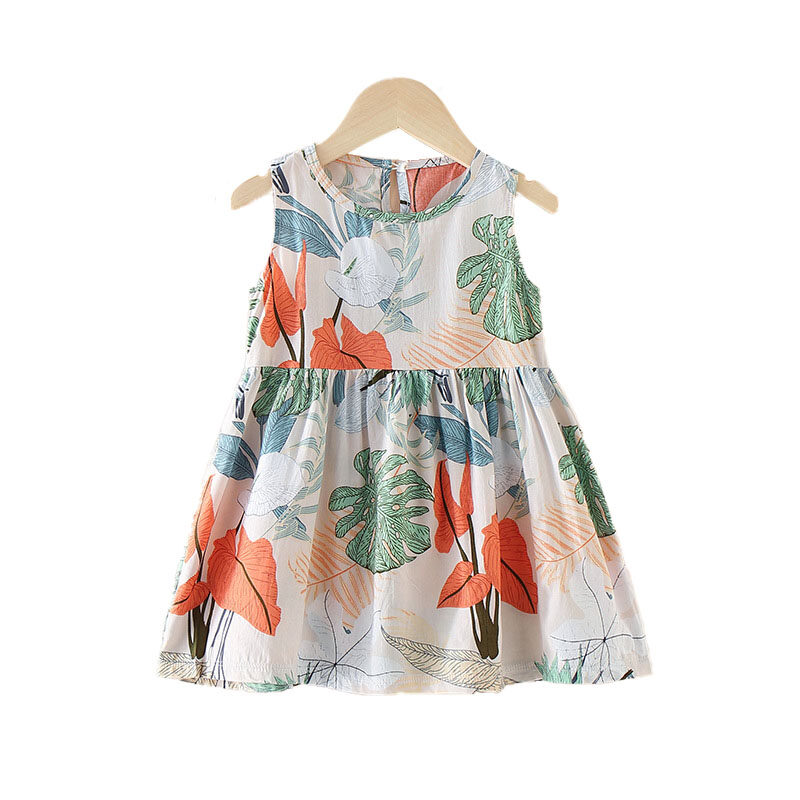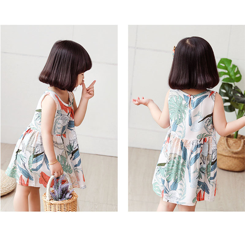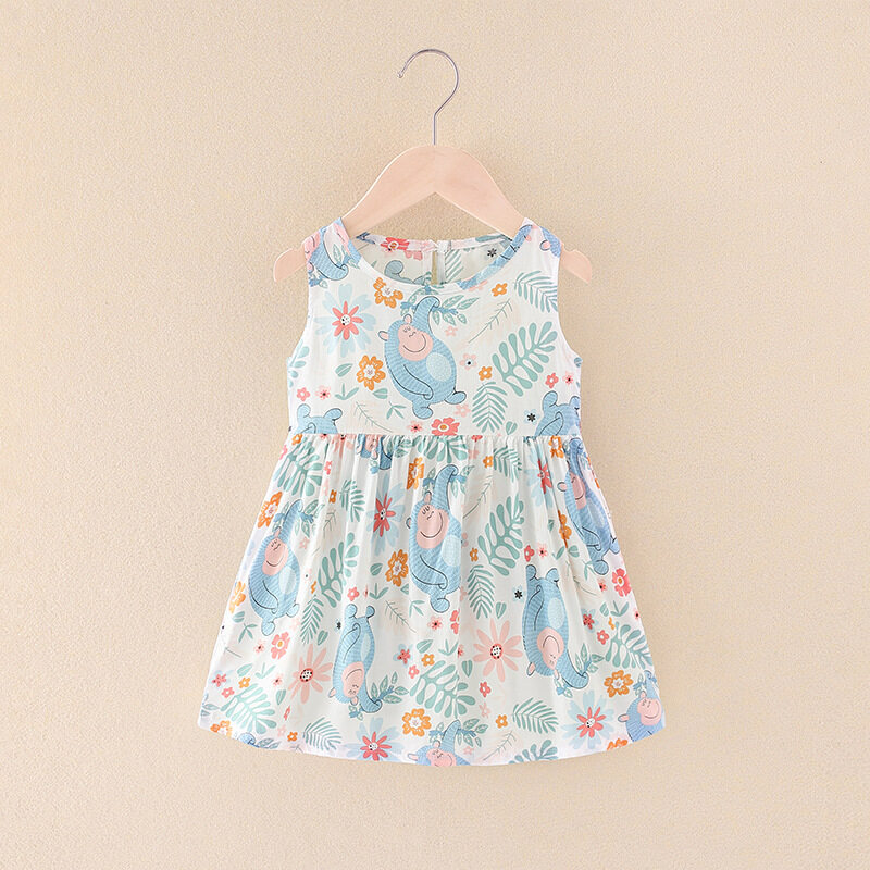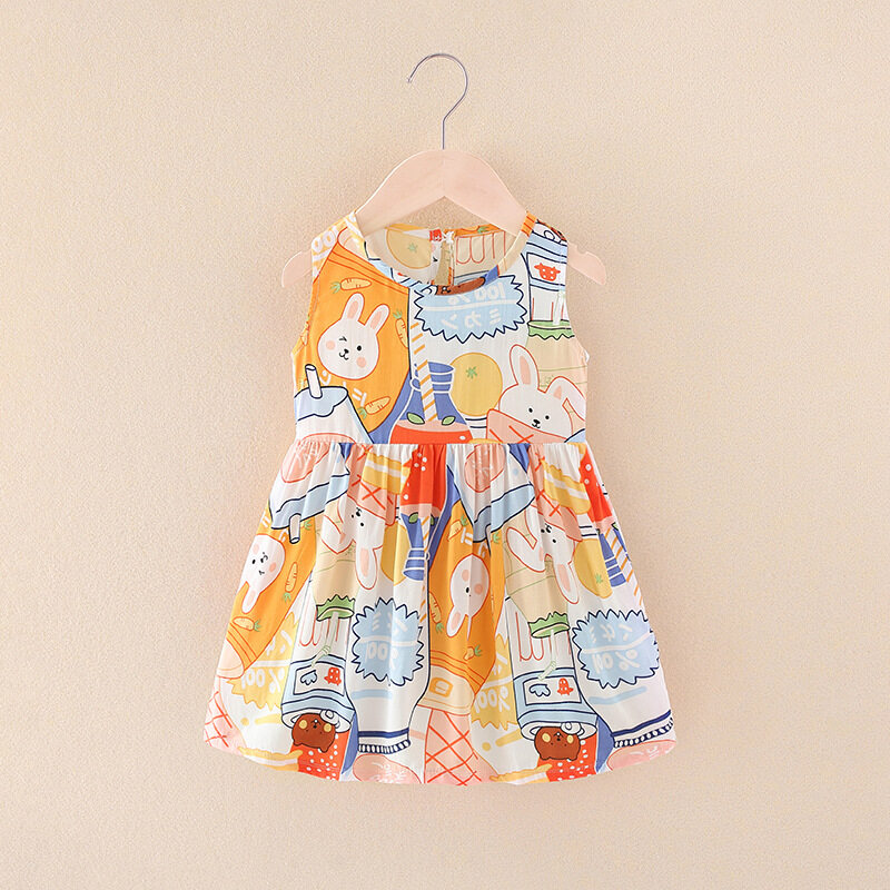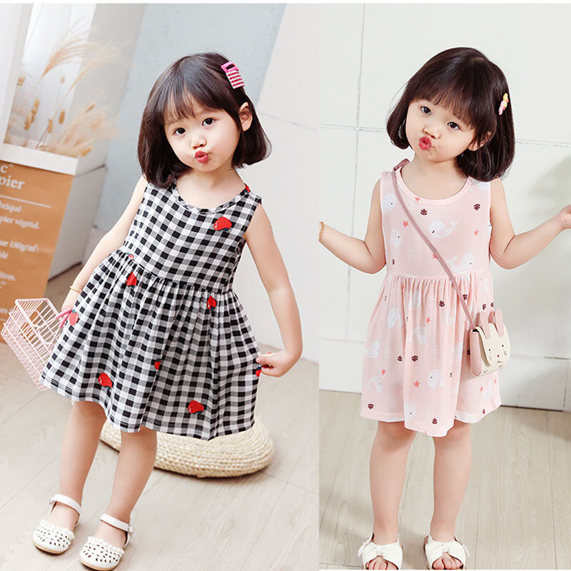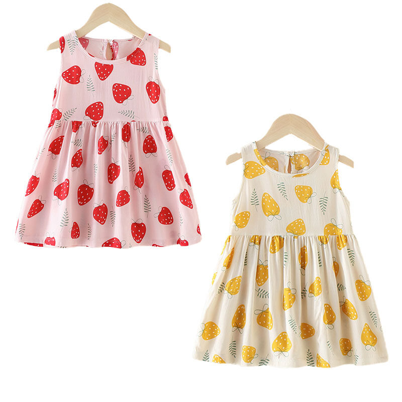 1-8 Years Korean Girls Cartoon Print Breathable Cool Dress Thin Strawberry Floral Little Girl Cotton Silk Sleeveless Skirt Plaid Casual Loose Princess Dress Top Vest Skirt