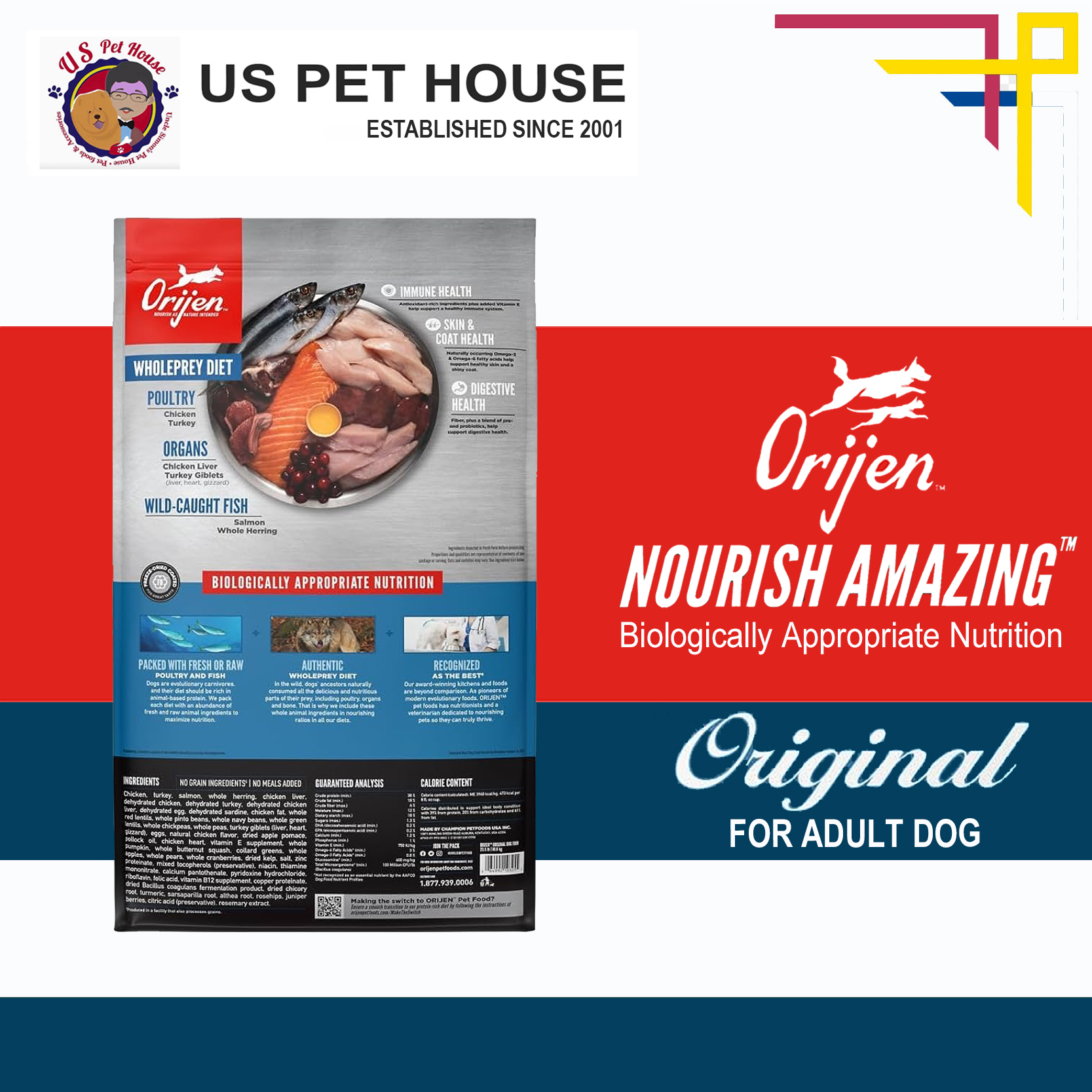 Help your dog thrive with the power of protein-rich recipes that provide peak nourishment. Dogs are ancestral carnivores, so they need a Biologically Appropriate diet rich and varied in whole animal ingredients. ORIJEN®Original diet is packed with 85%1quality animal ingredients like fresh or raw free-run2chicken and turkey, and wild-caught or sustainably farmed fish. Packed with WholePrey animal ingredients like organs and bone, ORIJEN food is made with the most nutrient-dense, succulent parts of the prey to deliver the nutrition dogs need. The result is a diet for your canine companion that is beyond comparison.