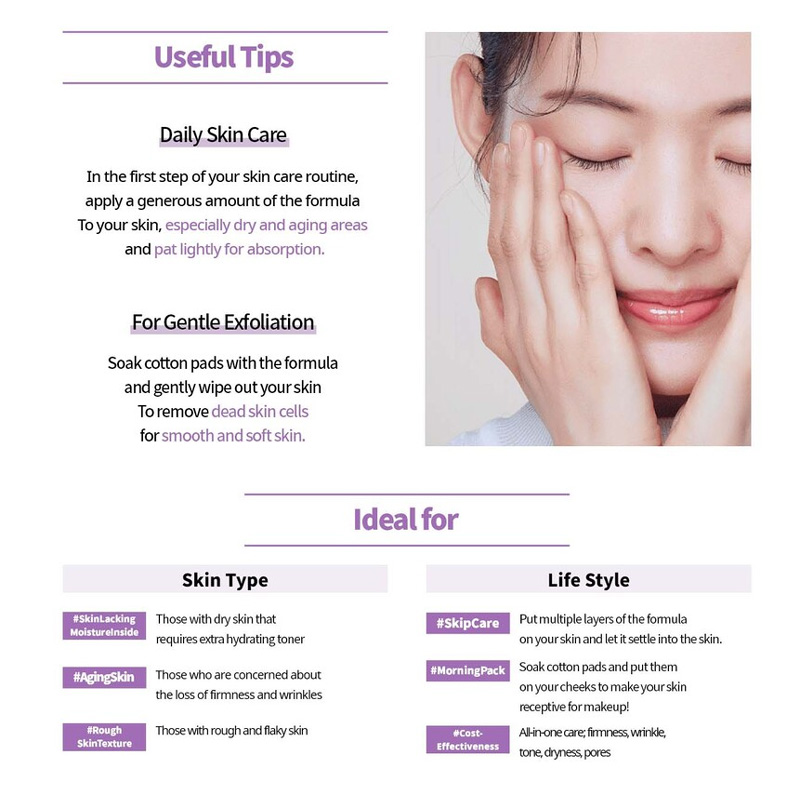 Volume / Weight 200ml / 232gIdeal for for all skin typeExpiration Date 36 monthsHow to Use Apply over face and neck after cleansing, then gently pat for better absorption.Manufacturer / Distributor Cosvision Co., Ltd. / innisfree CorporationCountry of Manufacture South KoreaIngredients WATER / AQUA / EAU, BUTYLENE GLYCOL, GLYCERIN, ALCOHOL, NIACINAMIDE, GLYCERETH-26, GLYCERYL POLYMETHACRYLATE, DIMETHICONE, PPG-13-DECYLTETRADECETH-24, PROPANEDIOL, AMMONIUM ACRYLOYLDIMETHYLTAURATE/VP COPOLYMER, GLYCERYL CAPRYLATE, ACRYLATES/C10-30 ALKYL ACRYLATE CROSSPOLYMER, HYDROGENATED LECITHIN, FRAGRANCE / PARFUM, ETHYLHEXYLGLYCERIN, ADENOSINE, POTASSIUM HYDROXIDE, DISODIUM EDTA, HYALURONIC ACID, SODIUM METHYL STEAROYL TAURATE, BETAINE, GLUCOSE, ORCHID EXTRACT, ACETIC ACID, TOCOPHEROL MFDS Evaluation of Functional Cosmetics YCautions for Use (1) For external use only. (2) Avoid direct contact with eyes. (3) If contact occurs rinse thoroughly with water. (4) Discontinue use and consult a doctor if irritation occurs. (5) Keep out of reach of children. Quality Assurance Standard Compensation for defective products is provided according to the criteria notified by the Fair Trade Commission. |
