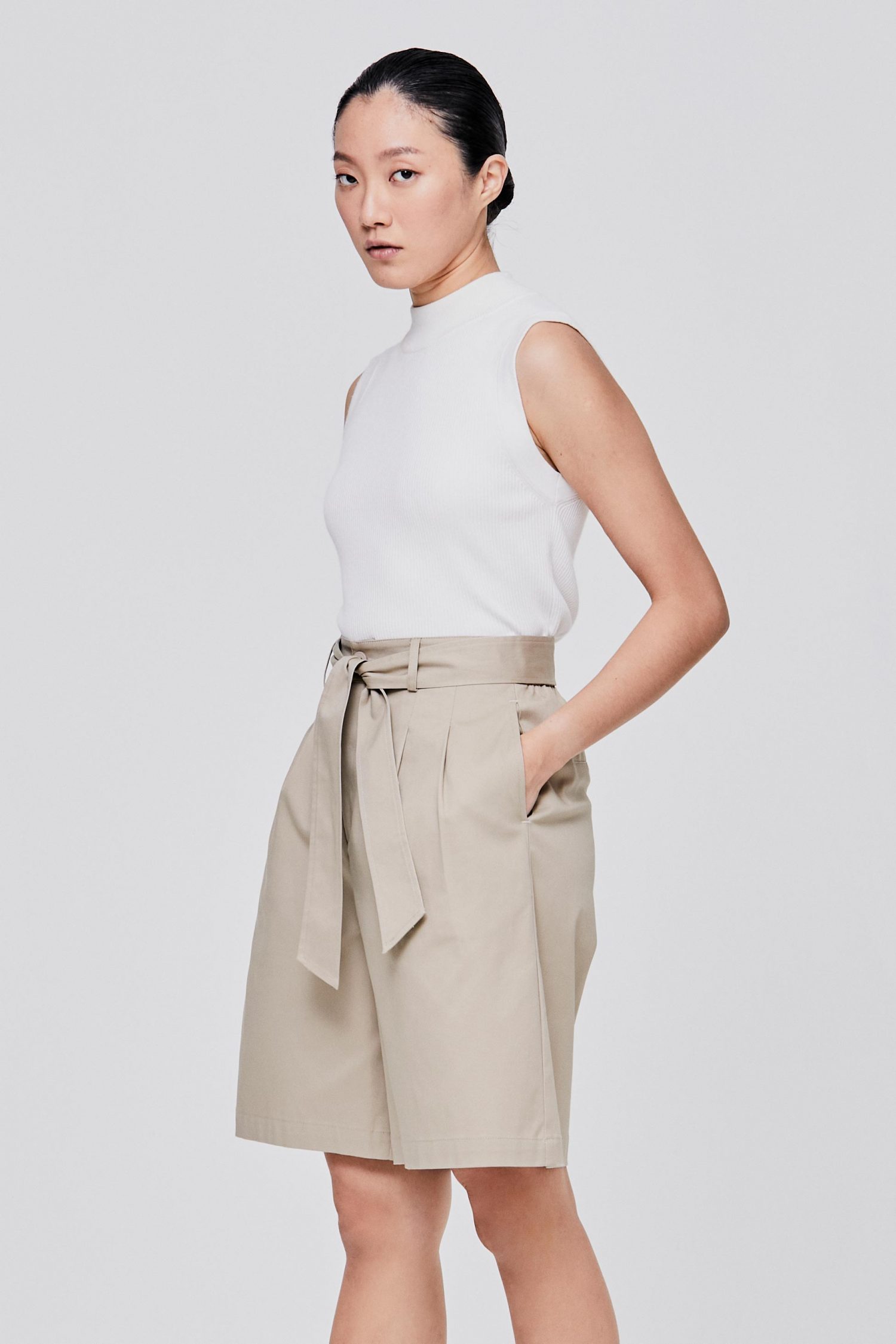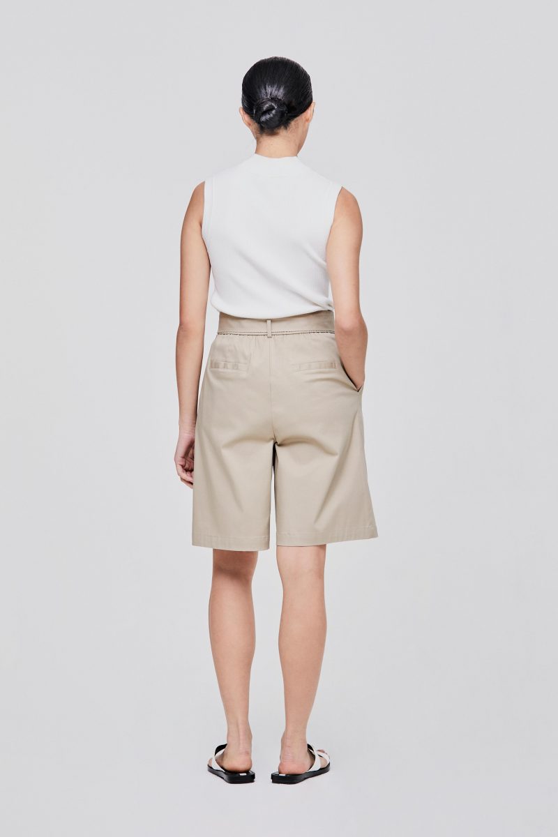 Standard front with button and zipperfly fastening Waist pleats detailing Side pockets Detachable waist sash detailing Back with decorative welt-pockets 97% Cotton, 3% Spandex