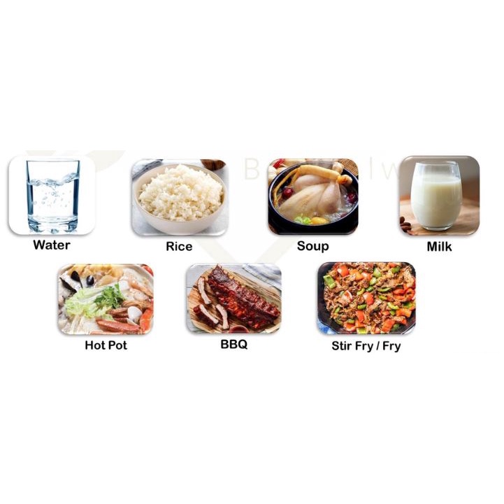 - 8 cooking functions: Hot pot, Fry, Stir Fry, BBQ, Soup, Rice, Milk & Water