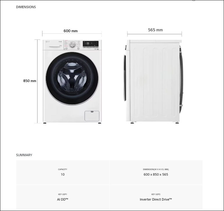 LG FV1410H3W 10/6KG FRONT LOAD WASHER DRYER COLOUR: WHITE WATER EFFICIENCY LABEL: 4 TICKS DIMENSION: W600xD565xH850MM 2 YEARS WARRANTY BY LG