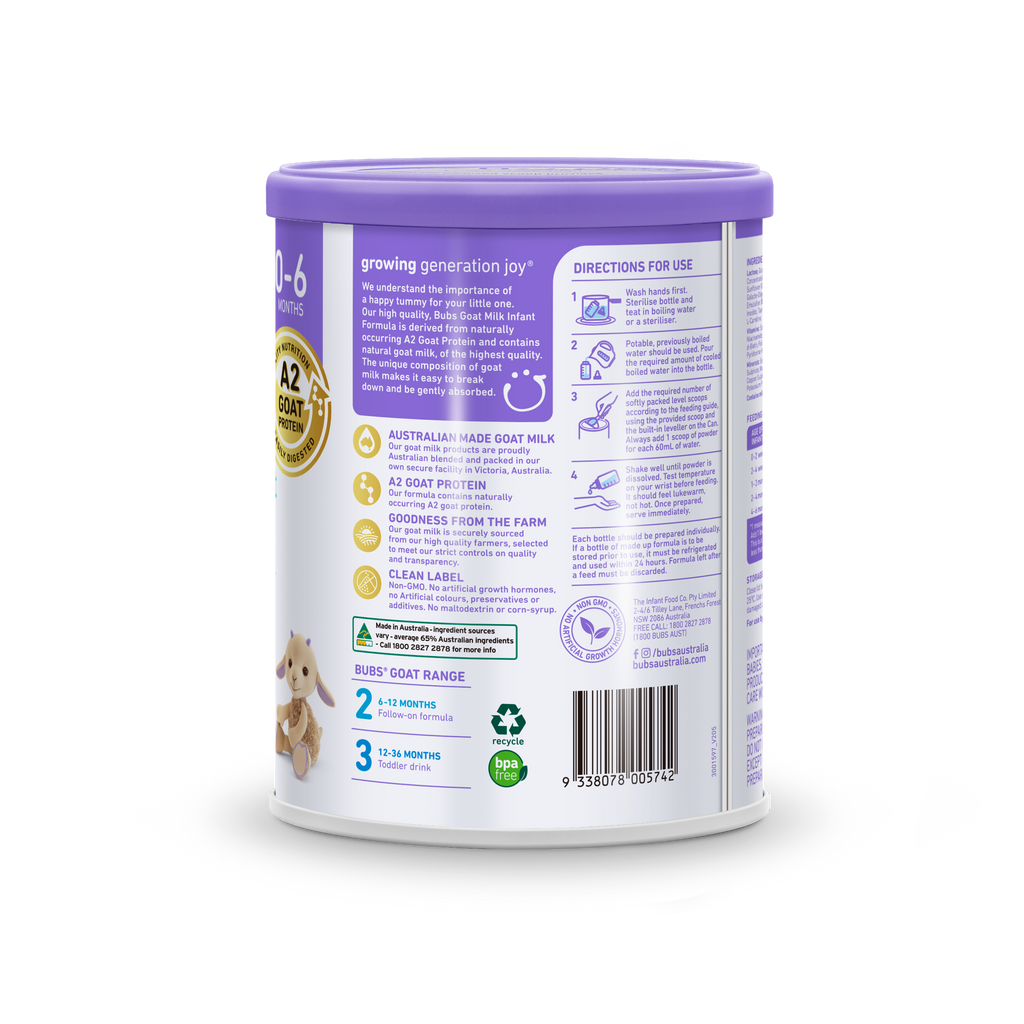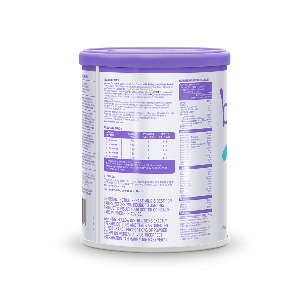 Bubs Goat Milk Stage 1 Formula is exclusively formulated for tiny tummies aged 0 to 6 months.