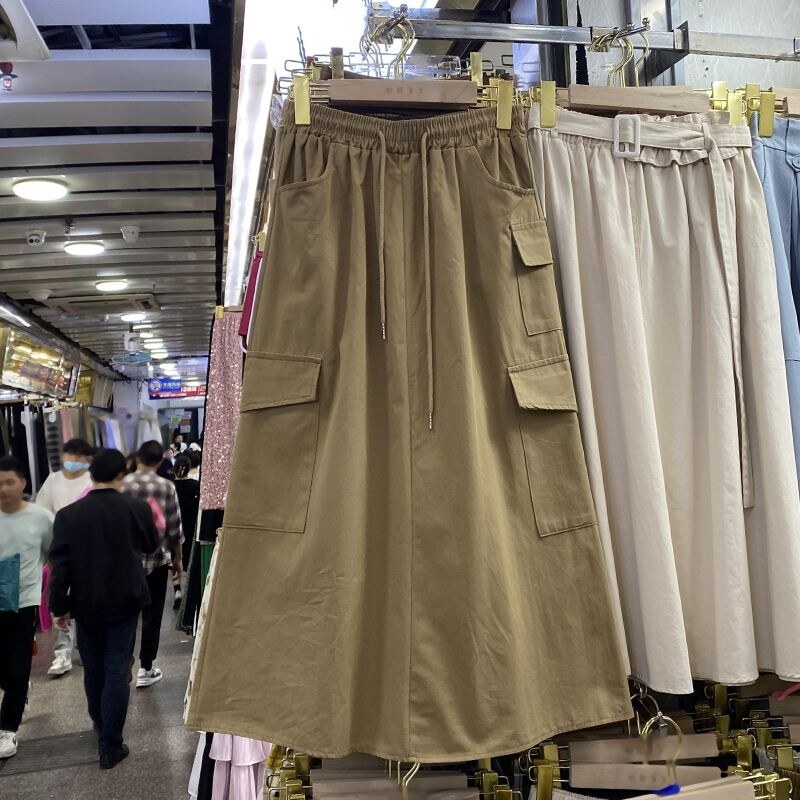 100.00kg Chubby Girl Summer K-style Women's Mid Length Long Length A- line Skirt Elastic Waist One Breasted Pocket plus Size Skirt