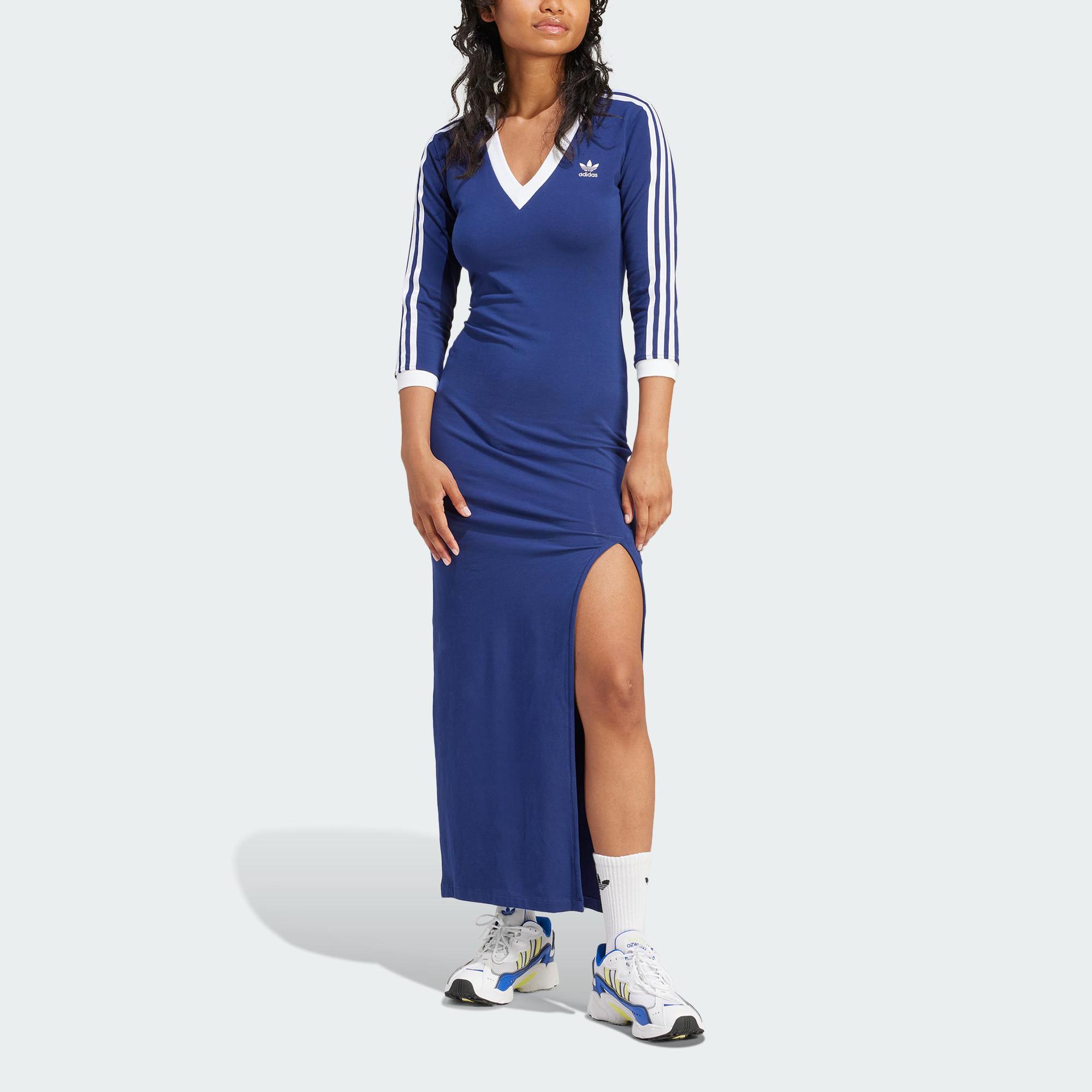 Make a statement without sacrificing comfort with the adidas Adicolor Classics 3-Stripes Maxi Dress. The soft cotton blend single jersey fabric allows for effortless comfort in a dress that's cut to hug the body. A V-neck and 3-Stripes along the sleeves add a sporty vibe. Perfect for everyday casual wear that ensures your style is always on point.We partner with Better Cotton to improve cotton farming globally. Better Cotton makes global cotton production better for the people who produce it, better for the environment it grows in, and better for the sector's future. Better Cotton is sourced via a chain of custody model called mass balance. This means that Better Cotton is not physically traceable to end products, however, Better Cotton Farmers benefit from the demand for Better Cotton in equivalent volumes to those we "source." Find out more here:bettercotton.org/learnmore