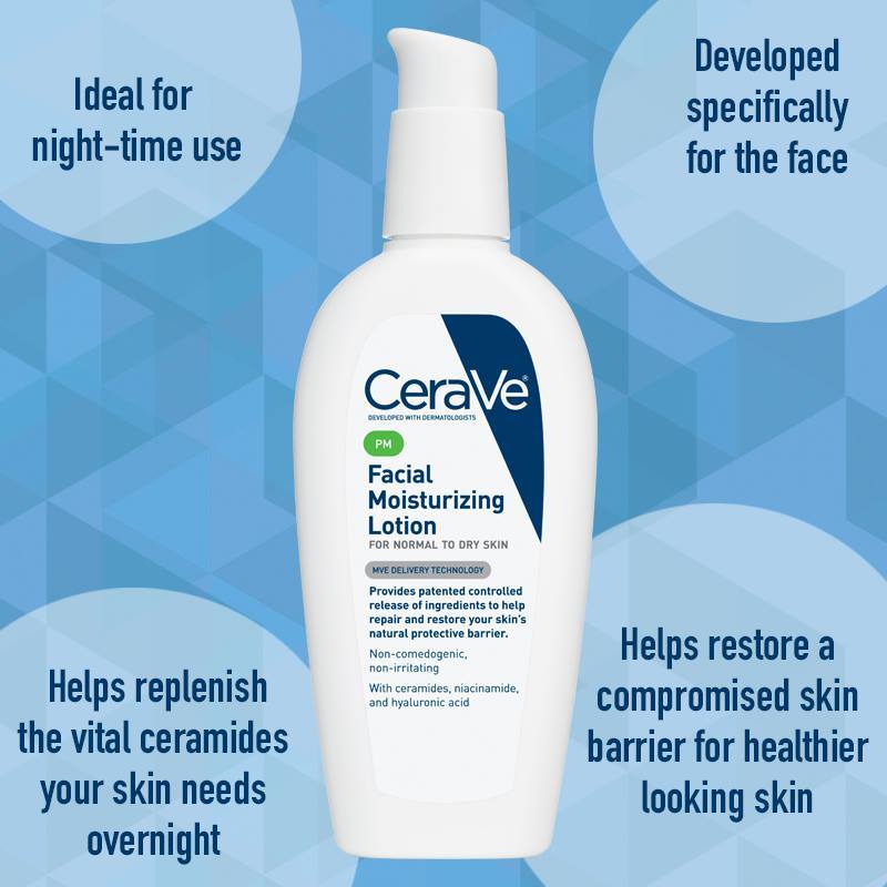 CeraVe AM Facial Moisturizing Lotion & PM Facial Moisturizing Lotion AM Facial Moisturizing Lotion: Elevate your morning routine with CeraVe AM Facial Moisturizing Lotion. This dermatologist-developed formula combines hydration and sun defense with broad-spectrum SPF 30 protection. Patented MVE Delivery Technology ensures a steady release of ceramides throughout the day, fortifying your skin's natural barrier for lasting moisture. Key Features: Hydration and Sun Defense: Seamlessly integrate hydration and broad-spectrum SPF 30 protection. Ceramide Technology: MVE Delivery Technology provides a continuous supply of nourishing ceramides. Broad-Spectrum SPF 30: Guard against UVA and UVB rays, preventing sunburn and premature aging. Gentle on the Skin: Non-comedogenic and fragrance-free, suitable for various skin types. Usage Instructions: Cleanse: Start with a thorough cleanse for optimal absorption. Apply: Gently apply to face and neck, ensuring even coverage. Reapply: Maintain sun protection by reapplying every two hours or more frequently if needed. Layering: Easily incorporate into your routine, applying before makeup for a smooth base. Precautions and Recommendations: Sunscreen Daily: Use daily, even on cloudy days, to protect against cumulative sun exposure. Avoid Eye Area: When applying, steer clear of the delicate eye area. Patch Test: Perform a patch test, especially for sensitive skin. Layering with Other Products: Compatible with other CeraVe skincare products. Layer over serums and under makeup. PM Facial Moisturizing Lotion: Complete your evening routine with CeraVe PM Facial Moisturizing Lotion. This dermatologist-developed formula focuses on hydration and skin renewal, featuring essential ceramides to strengthen the skin barrier while you sleep. Key Features: Nighttime Hydration: Provide overnight moisture for a rejuvenated complexion. Ceramide Technology: MVE Delivery Technology ensures sustained ceramide release throughout the night. Non-Greasy Formula: Lightweight and non-greasy, ensuring comfortable overnight wear. Gentle on the Skin: Non-comedogenic and fragrance-free, suitable for various skin types. Usage Instructions: Cleanse: Start with a gentle cleanse to prepare your skin. Apply: Gently apply to face and neck before bedtime. Precautions and Recommendations: Nightly Renewal: Incorporate into your nightly routine for optimal hydration and skin renewal. Avoid Eye Area: When applying, avoid contact with the delicate eye area. Patch Test: Perform a patch test before full application to ensure compatibility. Elevate your skincare with ceramides, whether facing the day or settling in for the night. Trust CeraVe for lasting hydration and skin defense.