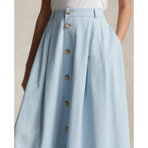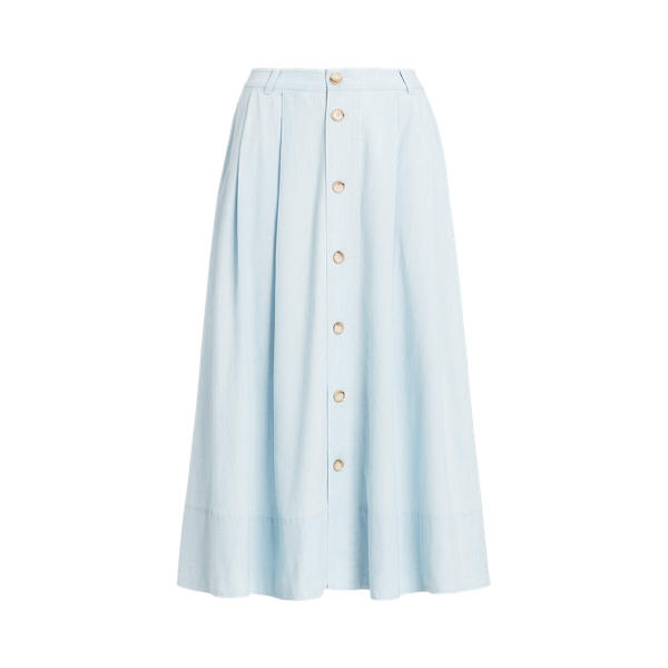 Made with lightweight Japanese chambray, this skirt has a fluid A-line silhouette and a buttoned placket.