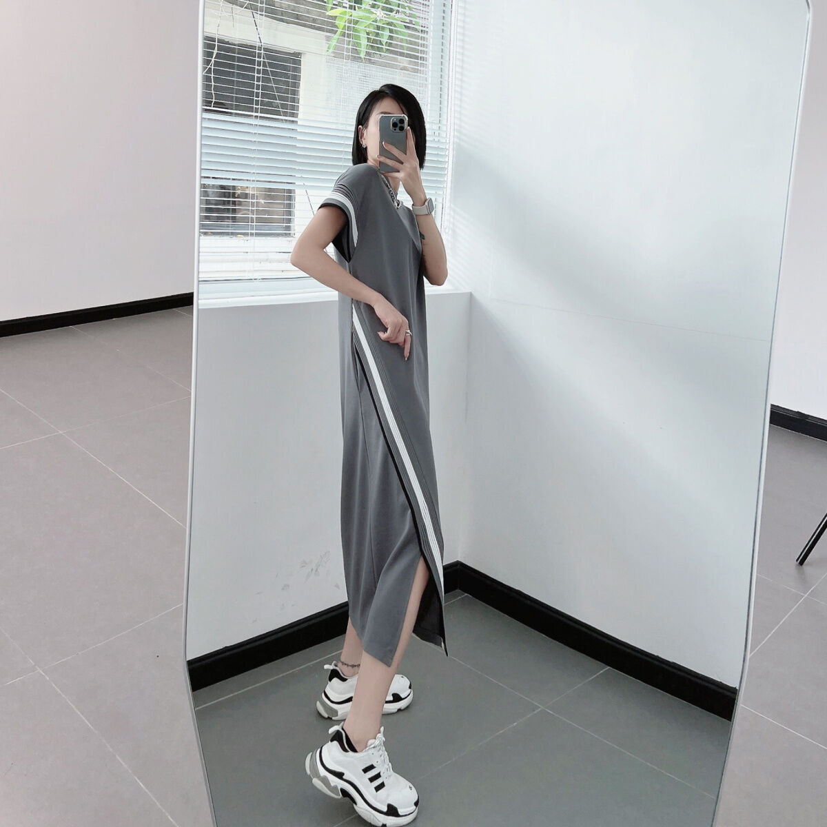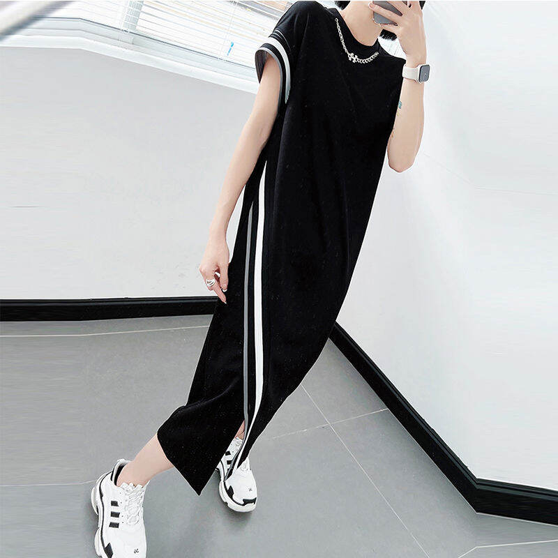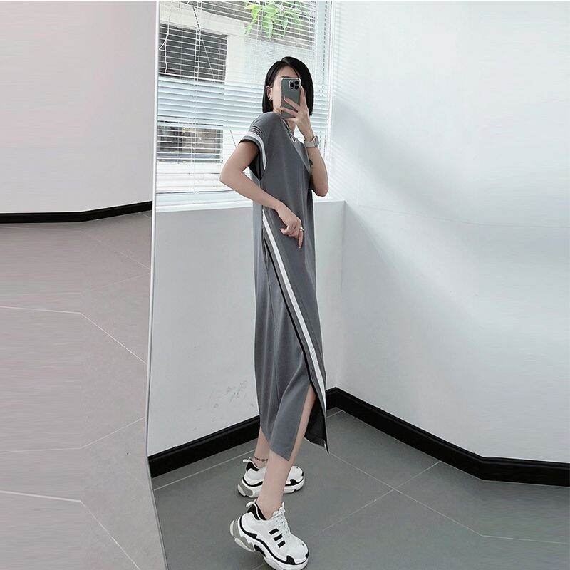 Summer Plus size women clothing Fat mm 1.00 Kg-150.00 kg Shoulder Dress Short sleeve Loose Slimming Belly Covering over the Knee Long Skirt