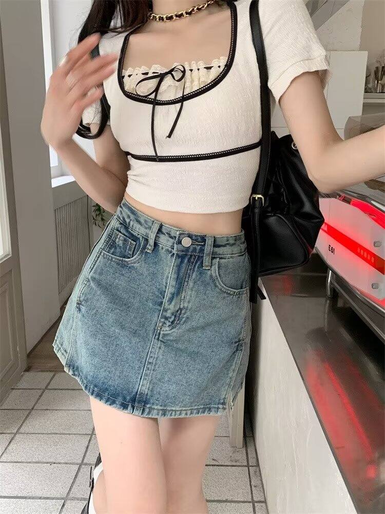 Sexy Split Denim Skirt 2024 Summer College Style High-Waisted Trousers Skirt Fashion Tape A- line Skirt Hip Skirt