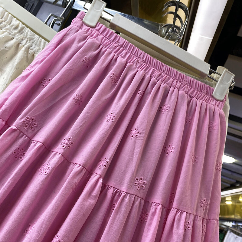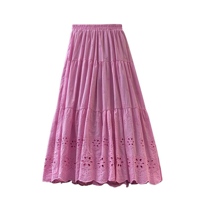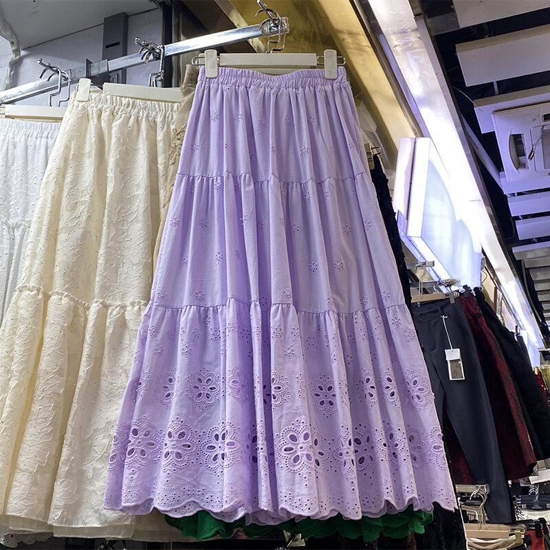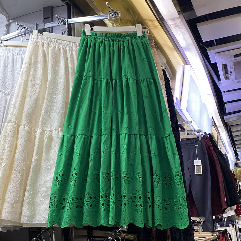 Gentle and All-Match Cut Out Embroidery Pleated Puffy A- line Skirt 2024 Spring and Summer New Arrival Covering Mid-Length Dress 338