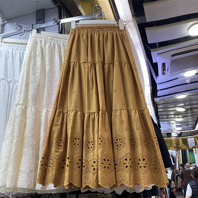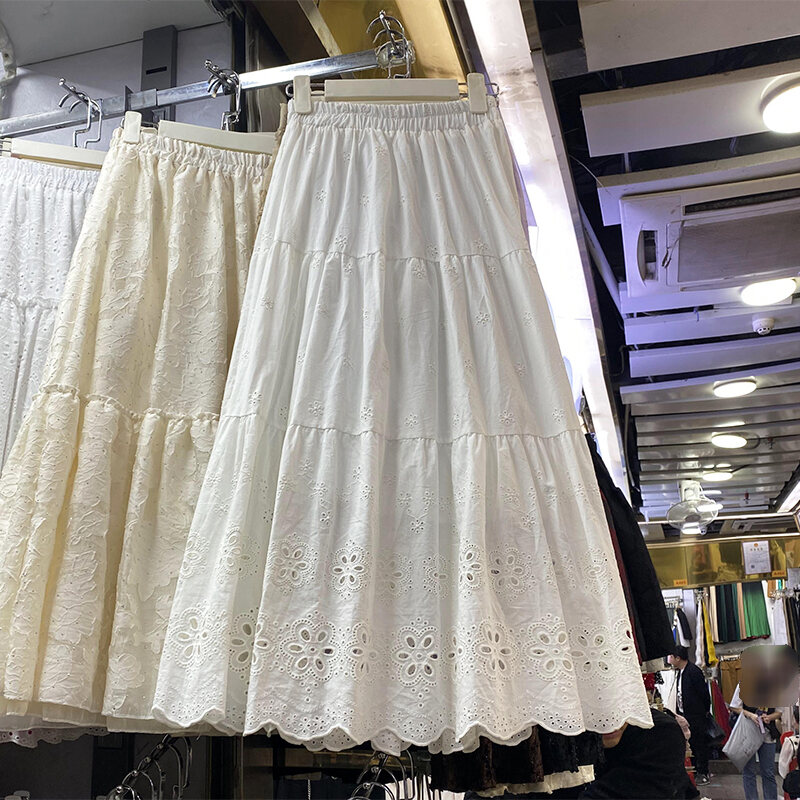 White Skirt Women's Spring and Autumn 2024 New Arrival Elastic High Waist Cover Slim Looking Mid-Length Tiered-Ruffle Dress Umbrella Skirt Ins