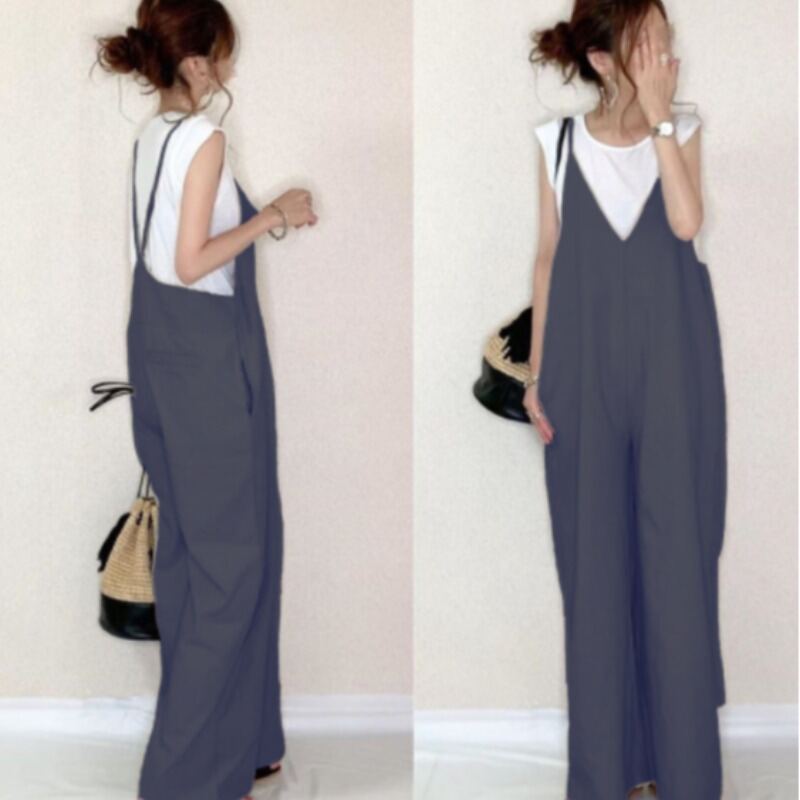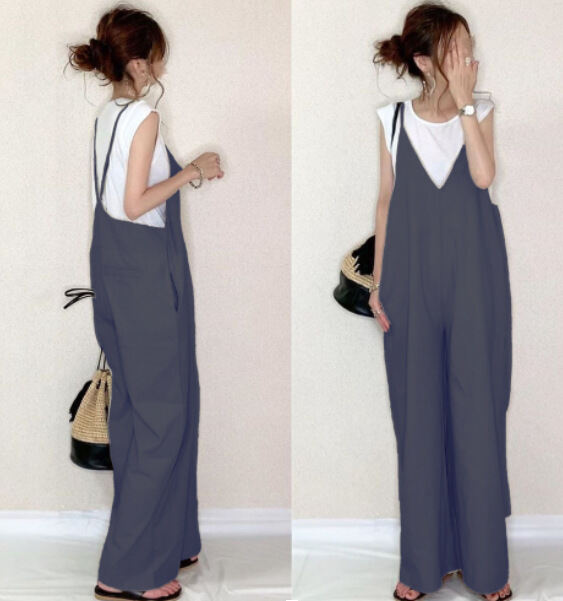 Cross-Border Foreign Trade Japanese Women's Clothing Jumpsuit 2023 Summer New Arrival Suspenders Solid Color Casual Loose All-Match Wide Leg Pants