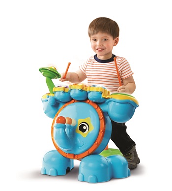 Get ready to rock with the Safari Sound Drums ™ by VTech®. Encourage your little one to be a star while they enhance creative thinking and motor skills by tapping out beats and creating their own sounds using the included drumsticks! They will enjoy this fresh way to practice counting and develop coordination while following along with the melodies and sing-along songs! Four game modes let your child tap the drums to learn counting, catch the lights, follow the leader or create their own composition. Your mini musician will love sitting on the stool and stepping on the elephant bass pedal to see the elephant trunk move up and down and create a fun bass sound effect. Watch them jam out to the beat of their own drum and create some sweet rockin' tunes!