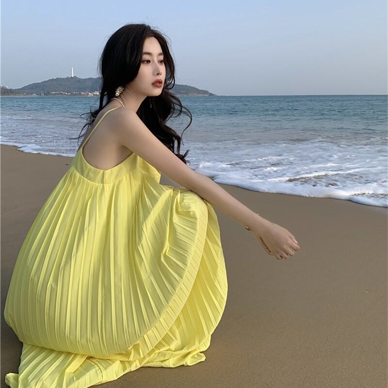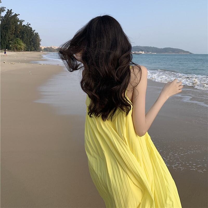 Bali Beach Skirt Seaside Holiday Dress Pleated V Neck Loose Slim and Sexy Backless Super Fairy Dress