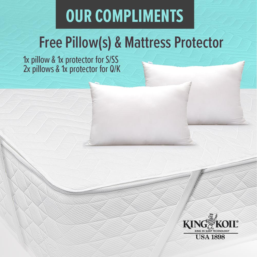 Complimentary: King Koil Luxury Pillow (1 x for Single/Super Single or 2 x for Queen/King) and King Koil Basic Waterproof Mattress Protector(corresponding size)
