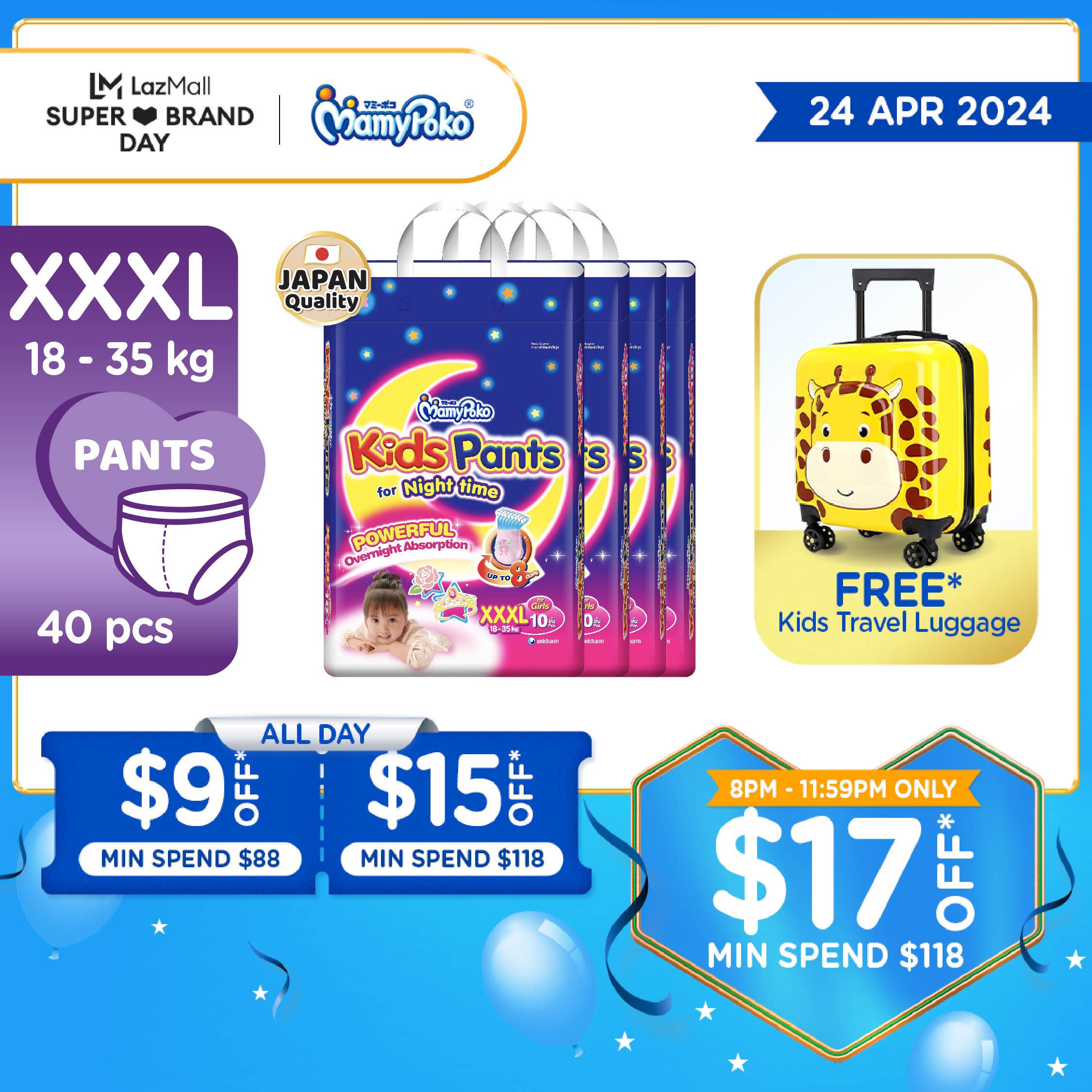 MamyPoko Kids Night Pants Girl Baby Diapers XXXL 10pcs x 4 Packs (18-35kg) [Carton]