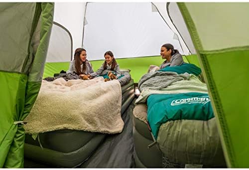 polyester taffeta 75D Made in the USA or Imported Measures 14 x 10 feet with 5-foot 8-inch center height Spacious tent has enough room for 6 people with 2 queen size airbeds Sets up in 15 minutes with rainfly and carry bag included Snag-free continuous pole sleeves with insta-clip attachments to stand up to winds WeatherTec System features patented welded floors and protected seams to keep you dry, angled rainfly lets in light but not water