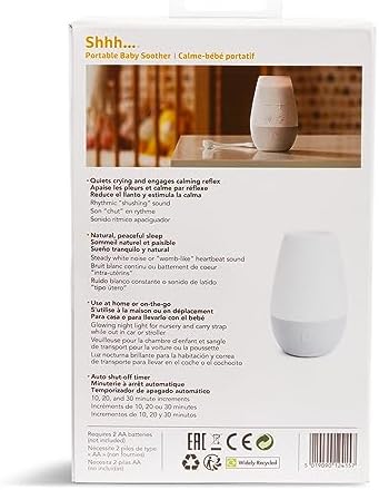 Portable light and sound machine calms little ones with three different sounds - shushing, heartbeat and white noise 3-D icons make it easy to find and toggle sound, volume and light controls in a dark or dim setting Soft night light can glow solid or pulse in sync with the selected sound Auto shut-off timer for 10, 20 and 30 minute increments - 30 minute maximum conserves battery life Battery operated, portable and perfect for on-the-go Requires 2 AA batteries (not included). To change the battery, simply line up battery and lock icon. Makes a great baby shower (or anytime) gift for new parents