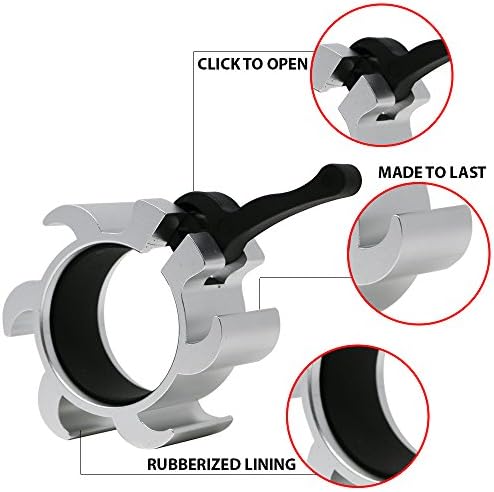 ★ STELLAR GRIP ★ - Our Barbell Collars fit securely around a standard 2” diameter Olympic barbell to provide a resilient, won’t-let-up grip to keep your bumper plates in place – no matter how many you have on the bar! ★ HIGH QUALITY CONSTRUCTION ★ – These Collars are made from durable and lightweight aluminum. Unlike plastic competitors, our collars have a rubberized lining to ensure a strong hold and protect the bar. This grip pad runs the circumference of the bar to provide even, locked-in support. ★ EFFORTLESS TO USE ★ – Our lock and release design is simple and solid. We made our collars easy to use to ensure you waste no time during your training. Quickly change the plates on your barbell to maximize gains. The collars are lightweight and transportable, so you can bring your personal, head-turning collars wherever you workout! ★ WHAT’S IN THE PACKAGE ★ – This package comes comes with (2) 2-inch in diameter, fine-looking, quick-release collars in Silver. ★ NO SWEAT ★ – Leave the sweating and swearing for your training! Buying from Synergee means quick and caring customer service! Customer Satisfaction is our Number 1 Goal!