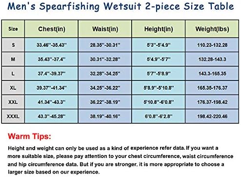 neoprene Import Neoprene: warm, breathable and quick-drying, help to improve the swimming speed and reduce drag of the water. Split Two-piece Design: Wetsuit top with diving hood and wetsuit vest pants as the picture shows, chest and knee pad design, make the diving movement more secure, enjoyable. Warmth and Protection: 3mm neoprene camouflage diving suit provides ample thermal protection and defense against sea lice, jellies and other biological irritants Perfect for all water sports like diving, spearfishing, scuba diving, swimming, surfing, stand-up paddle boarding, wave surfing, kayaking, canoeing, bodyboarding, wakeboarding, windsurfing. WARM TIPS: We have improved the wetsuit size based on customers’ feedbacks, and the size chart is update, please choose the right size according to the size table. Due to the manual measurement, spearfishing Wetsuit size exits ±2cm.