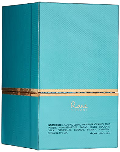 Rare Tiffany by Afnan is a Amber Floral fragrance for women Top Notes: Rose, Jasmine and Ylang-Ylang Middle Notes: Sandalwood, Vanilla and Musk Base Notes: Caramel, Ginger and Pink Pepper Suitalble for daily wear
