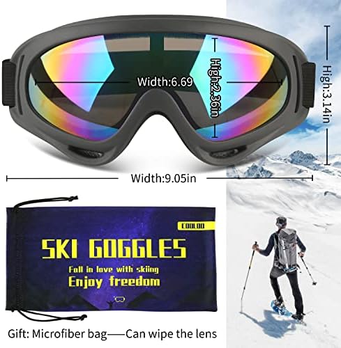Compatible with Most People - Bring COOLOO Ski Goggles out with your Family and Friends for outdoor sports! They fit teens, youth, men and women, Extra long elastic strap ensures great helmet compatibility with all helmets. Performance Ski Goggles - All lenses are coated with anti-fog coatings and circular holes are distributed around them to provide maximum airflow in the goggles, which can prevent fog to a certain extent. Tinted lenses provide UV400 protection to protect the eyes from UV rays. Clear lenses provide the best view on cloudy days. Safe & Comfortable - Using a safe, flexible ABS frame and sturdy and impact-resistant PC lenses can protect you from the sun, strong wind and heavy snow, and protect your eyes in all directions. In addition, a layer of sponge has a lightweight design, and its thickness is comparable to that of a multi-layer sponge, bringing warmth to you and the people you care about. Use in Multi-scene - Very suitable for snowboarding, skiing, skating, mountaineering, not only that, but also for riding motorcycles/mountain bikes, parachuting, bungee jumping, CS tactical field, experimenting in the laboratory, and use in construction sites , Get rid of the fear of wind, dust, cold air, snow, sunlight and lights. Customer-oriented Service - After purchasing the product, you will get, ski goggles x 2, handbag x 1, easy to carry. COOLOO provides each customer who purchases our products warranty and quick response and friendly customer service.
