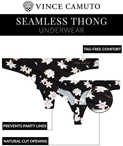 OFFICIALLY LICENSED VINCE CAMUTO: Women's Thong Panties; Committed to delivering the highest quality products, the most consistent branding, and unsurpassed value with passion, integrity, and loyalty SEAMLESS: Built with comfort in mind, these thong panties are seamless and tag-free so you can stay comfortable THONG STYLE: Women's underwear with a logo waistband that sits on the hips and natural cut leg openings; thong style helps prevent panty lines MULTIPACK VALUE: Get 5 or 10 pairs of seamless thongs for one great price EASY CARE: Machine Wash, Tumble Dry; Please Reference the Product Description for More Details #52,253 in Clothing, Shoes & Jewelry ( ) #141 in