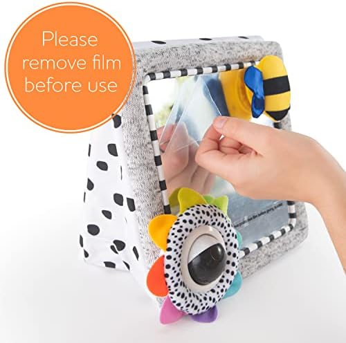 Baby-safe mirror allows baby to focus on a human face; preferred from birth Symmetrical bee inspires vision and encourages tactile exploration Easel back supports mirror on the floor; soft construction is perfect for baby's environment Rainbow colors around spinning tracker ball aids in the development of visual perception Baby begins to learn self-awareness, visual observation, and fine motor skills
