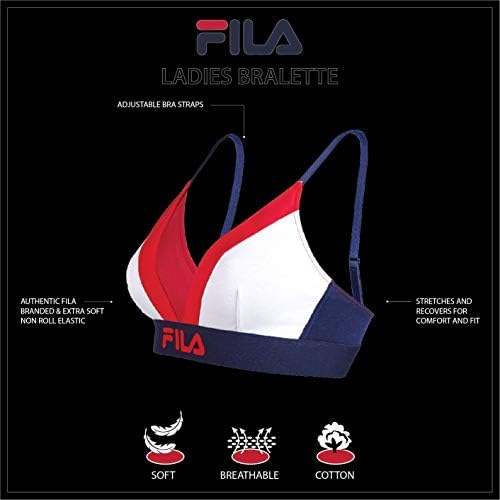 The Material: 95% Cotton and 5% Spandex. This bralette is breathable and soft- providing you with the ultimate comfort. A lightweight stretch and recovery supports your every move. Comfortable Fit: The Fila women's bralette has an elastic encased chest band that feels soft against the skin and provides a secure and comfortable fit. We offer sizes Small (4-6): 33.5"-34.5", Medium(8-10): 35.5"-36.5", Large (12-14): 38"-39.5" X-Large (16-18): 41"-43". Superior Design: Straps create stabilizing tension, helping to minimize bounce during multidirectional movement. The triangle cups are fashionable, yet comfortable under any t-shirt. Triangle silhouette perfect for lounge and layering. Features: A fashion classic, this Fila triangle bralette gives you low-impact support. Low-impact is ideal for yoga, Pilates and lounging. Pull-on. How to Wash: Washer and dryer safe. You can machine wash our products on cold with like colors. For a long lasting product, only use non-chlorine bleach when needed and can be dried in a dryer. We suggest hang drying our products to keep the fit as new as possible. #768,902 in Clothing, Shoes & Jewelry ( ) #5,103 in