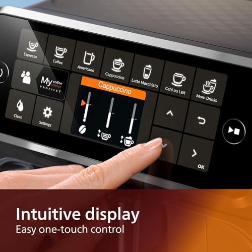 With Philips 4300 Series easily make up to 8 black and milk-based aromatic coffee varieties with the touch of a button! Enjoy the delicious taste and aroma of coffee from fresh beans at the perfect temperature LatteGo Milk System: Top your coffee off with a silky-smooth layer of milk froth Intuitive Touch Display: Select the perfect coffee for your mood with just one touch My Coffee Choice Menu: Adjust the strength and quantity of your beverage and choose from three different settings to suit your preferences. The Aroma Extract system intelligently strikes the optimum balance between brewing temperature and aroma extraction Powerful Filter and Easy Maintenance: Thanks to the AquaClean, enjoy clear and purified water - by changing the filter after being prompted by the machine, you will not need to descale your machine for up to 5000 cups
