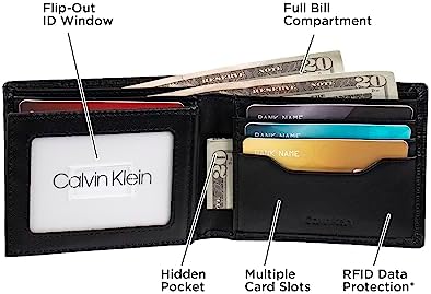 CK STYLE: Stay organized and stylish with this essential leather bifold wallet from Calvin Klein. This compact wallet is perfect for everyday use and fits in any pocket with ease. STORAGE CAPACITY: This wallet contains 6 card slots, 1 clear ID window, 2 slip pockets and 1 bill compartment to store your cash. RFID TECHNOLOGY: Crafted with an interior lining of RFID blocking fabric, this wallet is designed to help shield credit card and personal information. EVERYDAY FUNCTIONALITY: This modern designed wallet is the perfect balance of style and convenience. Whether you're planning to use for travel or everyday, this wallet will be a timeless accessory for any journey. #47,056 in Clothing, Shoes & Jewelry ( ) #145 in