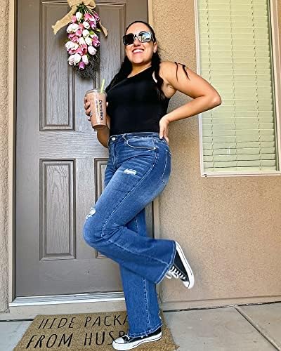 Women bootcut denim jeans, high rise, ripped and distressed denim pants, with functional pockets, easy zipper fly and belt loops, vintage fit. Flare jeans for women constructed from premium denim, enhance the body’s natural silhouette, creating more streamlined look; distressed look gives the illusion of jeans a retro chic flavor. Bell bottom jeans highlight the leg line, suitable for any figure, provide full comfort; high waist visually adds growth, show your long legs well. Great for casual daily life, outdoors, party, vacation, shopping, working and etc. High waist ripped jeans can pair with jacket, caidigan, sweater, t-shirts, crop tops, sweatshirts in different seasons. Distressed flare denim pants is a classic look, suit all body types at any age. Bell bottom jeans 32 inches inseam. Size Small fits Size 4 / Size 6, Medium fits Size 8 / Size 10, Large fits Size 12 / Size 14, X-Large fits Size 16 / Size 18, XX-Large fits Size 20 / Size 22. Machine washable in cold water, do not bleach. #213,443 in Clothing, Shoes & Jewelry ( ) #1,209 in