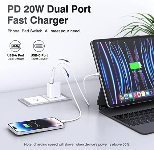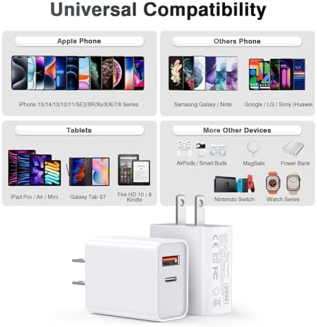 2-Pack Dual Port Fast Charging: Offers fast and efficient charging up to 3X faster than a 5W charger. Charge your iPhone 12 up to 50% capacity in just 30 minutes with the original cable. Cable not included, only 2 Chargers High-Speed Charging: The USB-C port supports a maximum power output of 20W. Dual-port design with USB-C and USB-A,charge two devices at the same time to minimize waiting time and frees you from messy chargers with various interfaces Universal Compatation: Designed for iPhone 13/12/11 Pro/12 Pro Max/iPhone 8 and later. The USB charging adapter is compatible with iPhone, iPad, iPod, smartphone, MP3 / MP4 players, play equipment, GPS devices, PC tablet, Google Nexus Tablet, Samsung Galaxy Tab and other digital devices compatible Compact & Portable: Incredibly compact size for enhanced portability.All this power comes installed in a pocket-friendly compact body, to go wherever the journey takes you. Ideal for home, office and on the go Safe & Reliable: Equipped with a smart chip, which can adjust the input power of the phone to prevent the phone from overcharging and overheating Connector type: usb type c