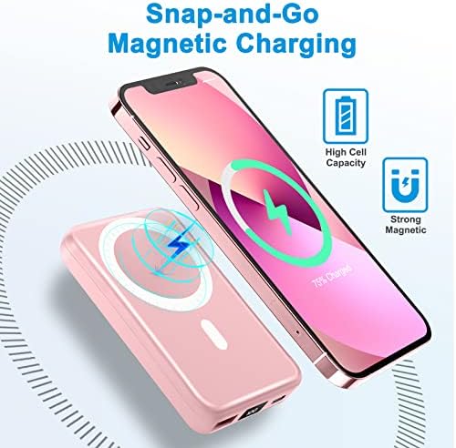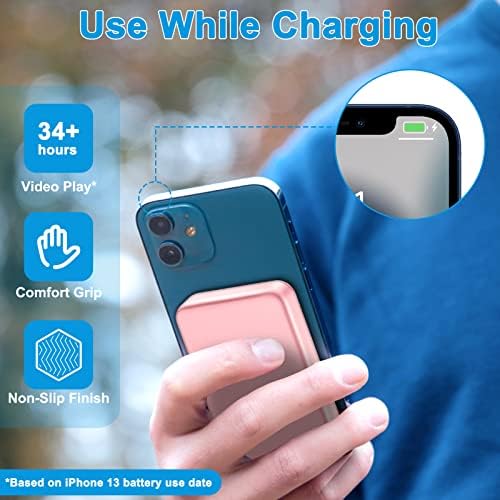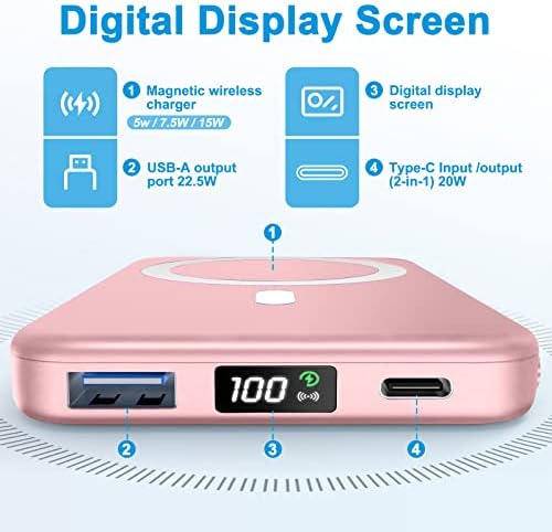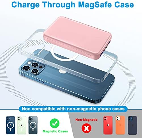 Made for iPhone 15&14&13&12 Series: Mag-Safe Wireless Portable Charger works with iPhone 15, iPhone 15 Pro, iPhone 15 Pro Max, iPhone 15 Plus, iPhone 14, iPhone 14 Pro, iPhone 14 Pro Max, iPhone 13, iPhone 13 mini, iPhone 13 Pro, iPhone 13 Pro Max, iPhone 12, iPhone 12 mini, iPhone 12 Pro, and iPhone 12 Pro Max ( Only compatible with Mag-Safe-certified phone cases or without cases ). Fast Charging & 10000mAh Large Capacity: Wireless Magnetic Battery Pack Built-in 8 low-temperature ice high-quality power core and phone magnetic patch for double strong mag-suction which Can hold your phone tightly and offer wireless charge 5W/7.5W/10W/15W devices and 22.5W USB-C output charge. The magnetic power bank can charge 3 devices at the same time. The Power Bank real 10000mAh supports 2 charges of iPhone 13&12&14 0.4lb Lightweight Design for Portability: Magbank wireless charger weights 0.4lb,the ultra-light design allows you to charge at any time and anywhere without any weight, which is perfect for put it in your pocket.The built-in baby-like silicone material is to better protect your phone from scratches during wireless charging Superior Safety:Our wireless phone charger and Mag-Safe bank charger with high quality chips supply safety protection of magnetic power bank includes overcharge protection, short circuit protection, reset protection, high temperature protection, etc What You Get: 10000mAh magnetic wireless power bank, USB-C cable. If any problem, feel free to contact us. We promise to solve your problem within 24 hours