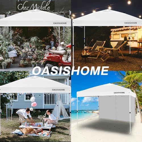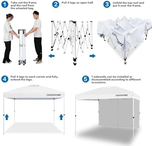 Thicker steel anti-rust coating frame, with legs width 28mm, and cross-bar width 28x12.8mm for the top bracket, sturdy and durable. 150 deniers high-density fabric water-resistant canopy roof, with silver-plated PU lining, can block 99% of harmful rays of sunlight. The sturdy frame is designed to be easily open and easily fold via its super convenient thumb latch button system. Set up is so easy, to finish the entire assembly work only needs two persons and takes a few minutes without tools. Take out the frame and the roof from the wheeled bag and unfold it ajar, unfold the top roof and put it over the frame, then pull 4 legs to each corner end fully, extend the legs, and the sidewall can be installed to block sunlight from one side. Three different sidewall height settings, 72 inches, 76 inches, and 80 inches, more headroom for inside activities. Portability, this tent comes with a bonus roller bag with heavy-duty wheels, made of 600 deniers coated PVC fabric, which is rugged and durable, put into a vehicle effortlessly and take to any place. It also can be a storage bag for the canopy tent without occupying space. What is included, 10x10 Ft pop-up frame; 10x10 Ft top roof; 1 removable high-density fabric sidewall; bonus 1 upgraded durable wheeled roller bag; 4 sandbags; 8 tent stakes; and 4 ropes. Multiple uses, this canopy provides 10'x10' shade coverage, big enough for 6-8 people with a table inside at the same time. It is suitable for patio, backyard, garden, wedding party, beach, outdoor sports, trade show, art event, camping, disaster relief, and more. Reminder, to prolong the service life of the canopy tent, please do not use it in strong wind, heavy rain, snow, storm, and bad weather accordingly.