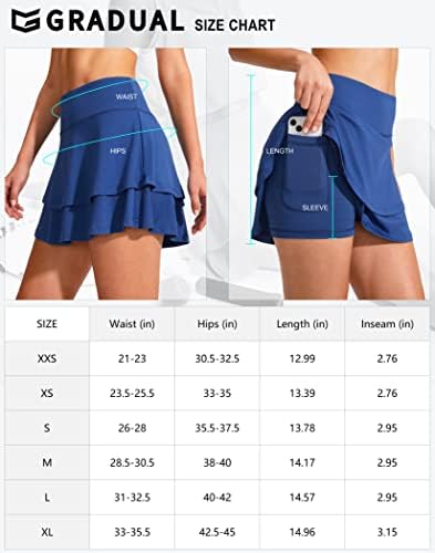 SOFT & COMFORTABLE MATERIAL: G Gradual tennis skirts for women are made from stretch, soft and lightweight fabric, wicks moisture away from your skin, keeping you comfort while playing golf or tennis. 4 POCKETS: Interior short features two pockets to store tennis balls and phone. The back zipper pocket and the hidden waistband pocket keep your keys and cash safely stored, free your hands while athletic. BUILT-IN SHORT LINER: The outer skirt provides freedom of movement, while the inner shorts are made of breathable mesh fabric which can keep your thighs from rubbing together and chafing. DOUBLE RUFFLE LAYERS & WIDE WAISTBAND: Tiered ruffle hem matching high waist essures your legs look slimmer and longer, high rise & wide waistband for a comfy and snug fit. VERSATILE SKIRT: Cute and sweet style shows your unique personal charm. Perfect for tennis, golf, running, workout, cheerleading, school, shopping, traveling, badminton, vocation, party and so on. #21,926 in Clothing, Shoes & Jewelry ( ) #19 in #13,179 in