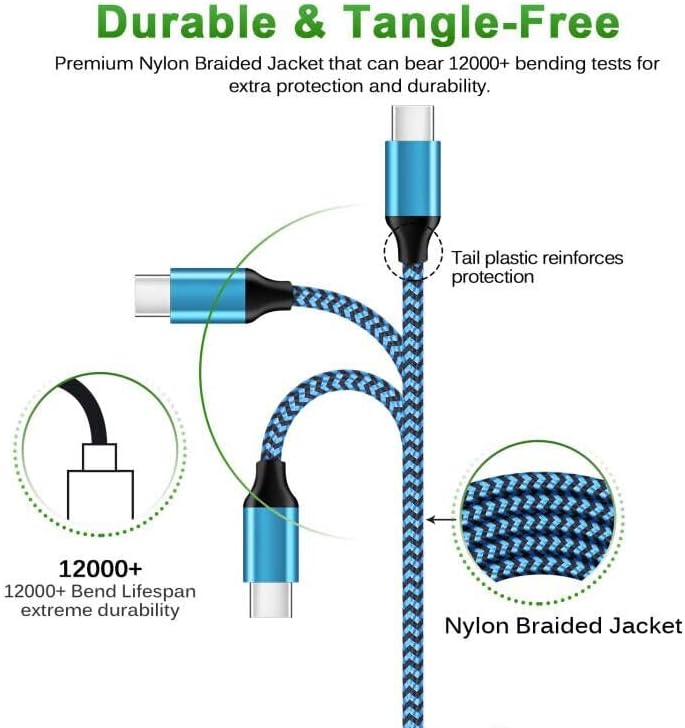 【Broad Compatibility】USB Type C Cable Fast Charging for Samsung Galaxy A15 5G,A14,A13,A54,S23 Ultra,S23+,A03s,A53,A23,A25,A24,S22,S21 FE/Ultra,S20 FE,S10e,S9,Z Fold 5 4 3,Z Flip 5 4,A12,A32,A52,A02s,A42,A52,A10e,A73,M52,M42,M32,Note20 Ultra/10/9;iPhone 15/15 Pro Max/15 Plus;Google Pixel 8,8 Pro,7a,7,7 Pro,6,6a,5,4a XL,4,3 XL,2;Moto Edge 5G UW,Edge Plus,Edge 20 Lite/20Pro,G100,G30,G10,G Play/Power/Stylus(2022),Z/Z2 Force/Z3/Z4;OnePlus Nord N200/N10/CE/10Pro/9/8T/7/6/5T and other type c device. 【3A Fast Charge & Sync】Android Charger Cable supports safe high-speed charging at 3A and data transfer speed up to 480Mb/s, 30% faster compared with other cables. Data Transfer and Power Charging 2 in 1. 56kO resistor provide outstandingly reliable conductivity & stability, protect your devices and charging adapters from damage. To achieve fast charging, you will need a usb wall charger rated for fast charging and a phone capable of the same. 【USB A to C Type C Charger Cord Enhanced Durability】Special Strain Relief Support design can bear 12000+ bending test, protect the most vulnerable joint of galaxy s22 charger type c usb cable. Premium aluminum housing and sturdy nylon fiber cover adds premium durability to the cable. Cables are tangle free & durable enough to withstand everyday heavy usage, but still in great performance. 【Special Design of USB C Cord】Nylon braided technology reinforces cord's durability, not easy to break and crack. 3ft USB C charging cable provides an extension for use, perfect for travel, home and office. Perfect 3ft long cord is enough for you to use without being restricted by the power socket location. The samsung c type charging cable support from both sides, can be inserted "positive and negative insert" function. 【What You Get 】3-Pack 3ft Nylon Braided USB 2.0 Type C Fast Charging Cable(White,Blue,Purple). 12-month worry-free warranty. If you have any concerns about our samsung android cell phone c charger cable, please feel free to contact us by email, we promise to help you resolve the issues ASAP.