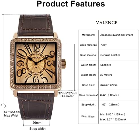 Brown ladies watch retro elegant square dial with exquisite craftsmanship,the ultimate gemstone watch designed for women. Easy-to-read dial womens watch with Arabic numerals,the use of the Japanese movement,scratch-resistant mineral crystal glass with high-definition and transparent. Featuring a 37mm case size,26mm watch band width,Wrist Size fits size from a minimum of 6.50-inch(165mm) to a maximum of 8.07-inch(205mm). The leather watch band is flexible and delicate,and the steel pin buckle is exquisite and beautiful,which is easy to wear and can be matched with various clothes. Water resistant to 30meters (100ft),withstands splashes or brief immersion in water.( But not suitable for swimming or bathing). #177,159 in Clothing, Shoes & Jewelry ( ) #483 in