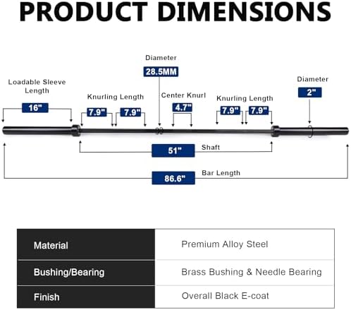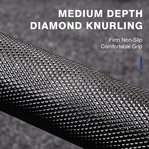 Incredible Value: Our goal is to design a best home gym Olympic weightlifting bar at an affordable price. Here we made it! We enhanced the steel hardening process and surface treatment to make our bars stronger for repeated use. The high-grade steel used in this 700LBS bar was tested with 130,000 PSI tensile strength, adequate enough to handle all your demands. And it has a stunning look and great feel with overall black e-coat finish. Top-Quality Bearing and Bushing: For those who are tired of tightening the hex bolt end sleeves, LIONSCOOL Olympic Bar is for you. Our barbell has sleeves with the snap rings at both ends maintaining stability for a lifetime. The 700LBS black barbell feature premium needle bearings and oil-impregnated brass bushings in each sleeve, providing smooth rotation and outstanding spin. You will feel the difference between this bar and others at once. Medium Depth Knurling with Dual Marks: LIONSCOOL Olympic bar offers 1.5mm diamond knurl with flattened top for a secure and non-slip grip while not being too aggressive. The dual knurl marks of 700LBS bars are designed for correct hand positions in both Olympic weightlifting and heavier powerlifting. Matte finish of the shaft provides a sleek look. Specifications: Full length is 2200mm (86.6”); Weighs 20KG; 700 pounds weight capacity; 28.5mm handgrip diameter; dual knurl marks and no center knurl. Loadable sleeves are 16.5” long; Shaft length is 51’’; 2-inches in diameter to fit any Olympic weight plates. Black E-coat finish attains unmatched oxidation and wear resistance, and the sleeves are smooth for easy, quiet plate loading. Versatile: LIONSCOOL 700LBS Olympic Bar can meet all your needs of conventional strength training and cross training workouts, suitable for beginners to professionals. It is perfect for Olympic lifting, cross training and powerlifting such as squatting, deadlifting, bench pressing. Get a full body explosive workout or target specific muscle groups to build mass and strength! Buy with Trust in LIONSCOOL: Each barbell has been precisely manufactured and rigorously tested to reach the exact amount of “whip” and “flex”. We always stand by the quality of our products and provide a LIFETIME WARRANTY on our Olympic bars. Just buy with confidence! A large workout poster is included. The bar is the cat's meow for sure.