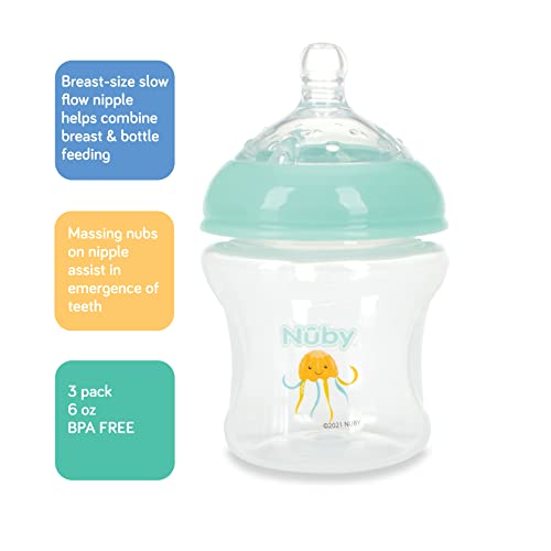 The 3-pack set of 6 oz bottles come with super soft, slow flow breast size nipples which are inspired by the shape, texture & natural flex of Mom's breast which encourages babies to latch-on more easily for a less stressful & happier feeding time. The bottle nipples have 3 unique advanced anti-colic valves which reduce air intake to help prevent painful colic & gas when your little one's feeding. The wide neck baby bottle, it's easy to fill and clean, has a leak-proof sealing ring and its natural shape makes it easy to hold with textured side grips to help too. The 3-pack set of 6 oz bottles have delicate whale, jellyfish, and turtle prints. BPA FREE, 0 months +, 6 oz, 3pk set: jellyfish, whale, turtle prints, dishwasher safe