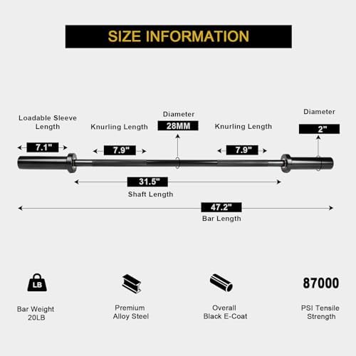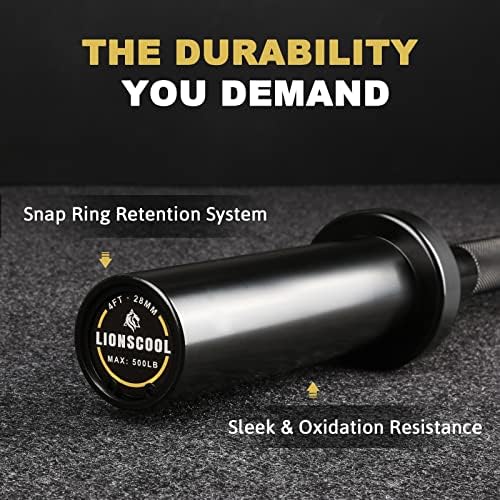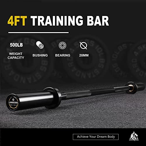 Commercial Quality for Home & Gym: Made of the same material as our Olympic barbells, our heavy duty 4 ft training bar will stand the test of time. The high-quality seamless steel was heat-treated to reach the weight capacity of 500LBS. The shaft and sleeves feature a unique black E-coat finish, delivering superb corrosion and oxidation resistance over time and a look that is stylish and aesthetic in your home gym. Outstanding Spin: Extra thick brass bushings and premium bearings in the sleeves makes for buttery smooth rotation. Snap ring retention system secure all the components of the sleeves for a lifetime. No more tightening the hex bolt end sleeves constantly. Medium-depth Knurling Provides Better Grip Feel: 1.5mm deep diamond knurling with specially trimmed top offers enough gripping power while delivering comfortable grip feel. 28mm diameter shaft is easy to hold and one knurl mark at either side helps to place your hands at correct positions. Specifications: Full length is 47.2” (4ft); Weighs 20LBS; 500 pounds weight capacity; 87,000 PSI tensile strength; 28mm handgrip diameter; No center knurl; No knurl marks. Shaft length is 31.5’’; Loadable sleeves are 7.1” long and 2” in diameter to fit Olympic weight plates. Excellent Performance in All Your Workouts: It is perfect for daily strength training and bodybuilding exercises that can be performed without the need of a power cage - bicep curls, upright rows, bent over rows, deadlifts, presses, hip thrusts, HIIT workouts, etc. Also, with its sleek all-black design, it is a gorgeous equipment for limited space home gym. Buy with Trust in LIONSCOOL: We trust the durability and strength of our barbell so much that we provide a LIFETIME WARRANTY against bending on our barbells, and we always stand by the quality of our products and offer excellent customer service you expect. Just buy with confidence! The bar also comes with a workout poster. Spring collars are not included. It is definitely the “Bang for Buck” bar for sure.