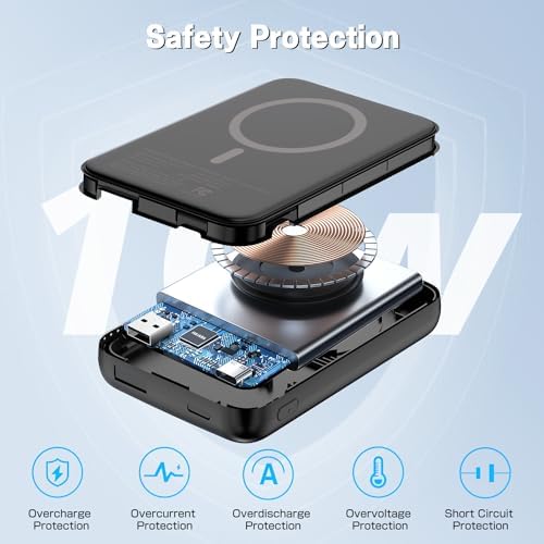 Powerful Magnetic Suction - For magsafe portable charger comes with up to 10N magnetic only for iPhone 15 pro/pro max/mini, iPhone 14 pro/pro max/mini, iPhone 13 pro/pro max/mini, and iPhone 12 pro/pro max/mini, which can easily and stably attach to your phone so that you don't have to worry about being disturbed while you're gaming/talking/taking photos with your cellphone due to charging. Wireless Charging - Say goodbye to the annoying data cables. The wireless charging mode of the portable power bank is not only tailor-made for iPhone 8/X/Xs/Xr/11 and newer models but also for Samsung Galaxy, etc other Android phones that support wireless charging. 【NOTE: The wireless magnet power bank is only compatible with mag-safe case】 5000mAh Multi-Device Charging - The wireless portable charger combined with USB C and USB A ports widely works for most devices, which means you can charge up to 3 of your devices at the same time, or share with two of your best friends or families. 5000mAh small battery charger is just right for you, to be your phone's second battery pack. Slim & light Body - Only 0.56-inch slim and 4.3 oz light as you want, the small size just a little bigger than a bank card will not block the phone camera. It is the perfect travel companion to put in your pocket, in your bag, and anywhere. Safety Protection - Built-in premium chips and a powerful safety system provide overcharge/overcurrent/over-discharge/overvoltage/short circuit protection. The portable phone charger has passed repeated multiple tests and can be used with peace of mind. and It is allowed to be taken on the plane.