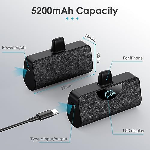 【Small and Ultra-Compact】Size of a lipstick,no need a data cable. It’s easy to slip in your pocket or your purse and incredibly portable. Mini portable charger each one size just is 3x1.5x1.02 inch ; Weight around 100g. 【Portable Plug-in Power Bank】No Need Extra Cables for Charging iPhone,the built-in interface allows you to charge your iPhone anytime, anywhere, without having to carry charging cable with you. Stylish and shiny design makes it elegant and unique. 【Dual Input and Smart LCD Display】Dual Input , You can use your iPhone cable or Type-C Cable(Including Package) to charge this small power bank. Smart LCD digital display can easily track the status of your charge.(Notes: The USB-C charging port support for both input and output.) 【5200mAh Emergency Battery Backup】The mini Power Bank Built-in 5200mAh high-quality Li-polymer battery, most iPhone can be fully charged at least once, which is very suitable as a backup power supply for daily use. As an emergency battery pack,it is great combination of the size and capacity. 【Mini Potable Charger Designed for iPhone Series 】Portable iPhone charger is widely compatible with iPhone 14, iPhone 14 Pro, 14 Pro Max,iPhone 13, iPhone 13 Pro, iPhone 13 Pro Max, iPhone 13 Mini, iPhone 12, iPhone 12 Pro, iPhone 12 Pro Max, iPhone 12 Mini, iPhone 11, iPhone 11 Pro, iPhone 11 Pro Max, iPhone XR, iPhone 8, iPhone 8 Plus, iPhone X, iPhone 7, iPhone 7 Plus, iPhone XS Max, iPhone XS, iPhone Se, iPhone 6s, and also other iPhones etc. 【36 Months Support Services 】5200mAh mini power bank x 2 , USB C cable x 2, user manual x 1. AND 36 months warranty policy and 24 hours friendly customer service. easy-to-reach support! Any question, please kindly contact us. 【Important Tips !! 】This small portable charger is compatible with phone case thickness less than 4MM. If your phone case thickness is beyond 4MM, the charging port can not plug into charging slot, you need to remove your phone case.