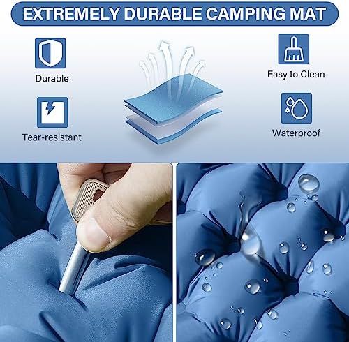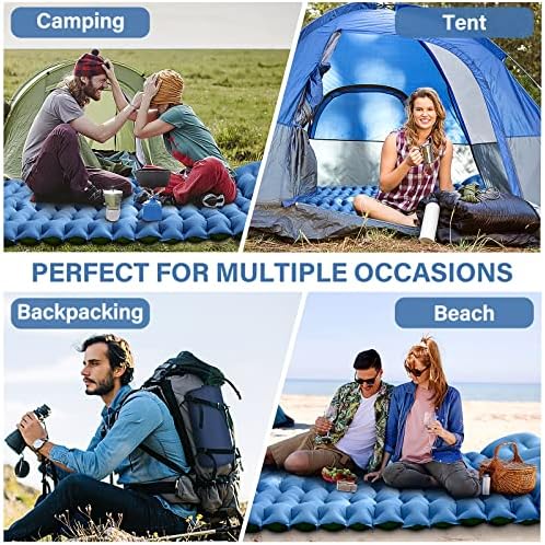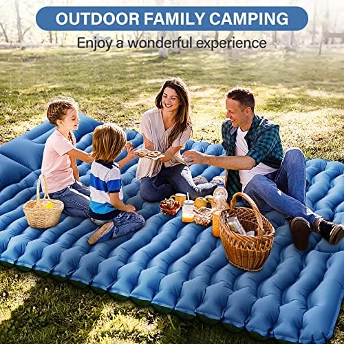 ☀ EXTRA THICK & WIDE 2 PERSON CAMPING PAD☀ If you are tired of those cramped ones, this double sleeping pad will meet your needs, up to 79.8"*53.5" when inflated, big enough for 2 tall people. The 4" thickness allows your body to keep off the hard ground, providing better support whether lying flat or on your side for a good night's sleep during camping. ☀ EASY TO INFLATE & DEFLATE ☀ The inflatable camping pad is equipped with a built-in foot pump, which can be fully inflated by stepping on it for 1-3 minutes, with no mouth or additional air pumps. The two double-layer valves on the pillows can effectively prevent air leaking and deflating in seconds. NOTE: Inflation time depends on how fast you pedal, and the hardness of the air pad depends on how much you prefer to inflate. ☀ RESISTANT & COMFORTABLE CAMPING MAT ☀ 2 Person Camping Sleeping Pad is made of camping grade 40D nylon and TPU-coated hard-wearing and no tearing fabric for many different terrains, resistant enough for the harsh outdoors. Ergonomic design and pressure-dispersing water ripple design bring a comfortable camping experience. ☀ THE BEST ULTRALIGHT COMPACT SLEEPING MAT ☀ This double camping mattress only weighs 3 lbs and can be compressed to 12*5.9*5.9 inches, which is as small as a water bottle. With a built-in air pump and pillows, there is no need to carry extra pillows. It fits easily in your backpack, and it's ultra-light and space-saving, you can take it with you wherever you go backpacking, hiking, climbing, camping, and traveling. ☀ 100% RISK-FREE PURCHASE ☀ We offer a one-year warranty for this camping mat. We hope you are pleasure with this 2 people camping sleeping pad! Owning it will bring you more happiness. If you have any questions or suggestions, please feel free to contact us! Besides, this camping mattress is easy to clean, if there is any dust or dirt, just wipe it down with a damp cloth.