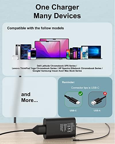 USB C LATITUDE CHARGER POWER SPECS: Output 5V-3A/ 9V-3A/ 12V-3A/ 15V-3A/ 18V-3A/ 20V-3.25A, Input: 100-240V 50-60Hz, Connector Type: USB Type C, Watts: Max 65W, Cable Length: 11FT. TYPE C LAPTOP CHARGER FOR DELL: Compatible with Dell Latitude 5330 5430 5440 5540 5530 7430 7340 7440 7530 7640 7330 9430 E5430 3440 3540 e5440 Charger, Dell Chromebook 3110 2 in 1 Charger, Dell Inspiron 13 5320 2 in 1 14 7420 2 in 1 14 7425 2 14 7430 in 1 16 7620 2-in-1 Charger, Dell XPS 13 Plus Charger. Dell Computer Charger. 65W USB C CHARGER FOR DELL LAPTOP: Compatible with Dell Latitude 5420 7420 5520 7390 7389 7400 7410 5290 7320 5320 e5420 2 in 1charger, Dell Chromebook 3100 2 in 1 charger, Dell XPS 13 9305 9360 9365 9370 9380 charger, Dell intel core i5 i7 Laptop Charger, Dell Latitude Charger. FEATURES FOR DELL CHARGING ADAPTER: Charging Indicator, Fast Charging, Lightweight Design, Short Circuit Protection, Travel, New Slim 65W USB C Laptop Charger. SAFETY AND GUARANTEE OF DELL LAPTOP CHARGER: 24 Hours On-Line, 12 Months Warranty, 30 Days Money Back or New Replacement. Package: 1 x 65W AC Power Adapter, 1 x Power Cord.