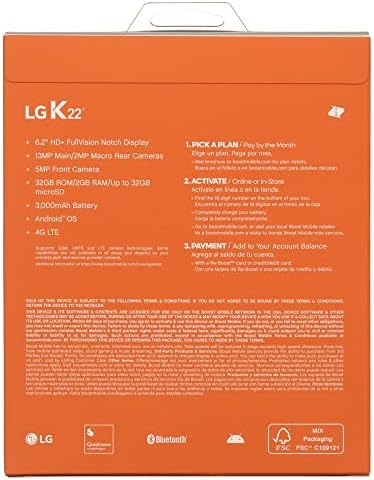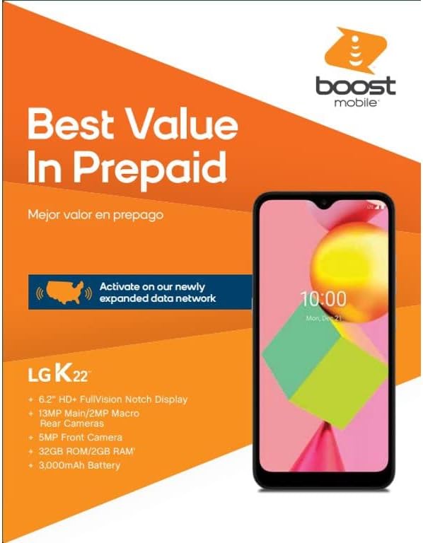 Carrier locked to Boost Mobile. Cannot be used on any cellular carrier other than Boost mobile. 13 MP, 27mm (wide), 1/3.1", 1.12µm, PDAF rear camera, 2 MP, (macro) front camera Proven reliability - the K22 passed 8 MIL-STD 810G testsStay powered up on-the-go with the 3,000mAh battery 155.7 x 75.4 x 8.4 mm (6.13 x 2.97 x 0.33 in). 169.5 g (6.00 oz) Card slot: microSDXC. 32GB memory, 2GB RAM Wi-Fi 802.11 b/g/n, Wi-Fi Direct, 5.0, A2DP, LE Bluetooth 6.2 in diagonal, 19:9 display No SIM card included.