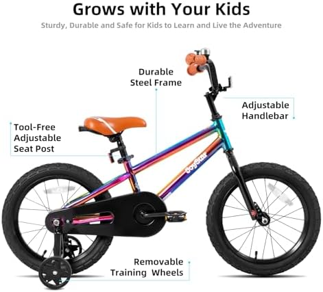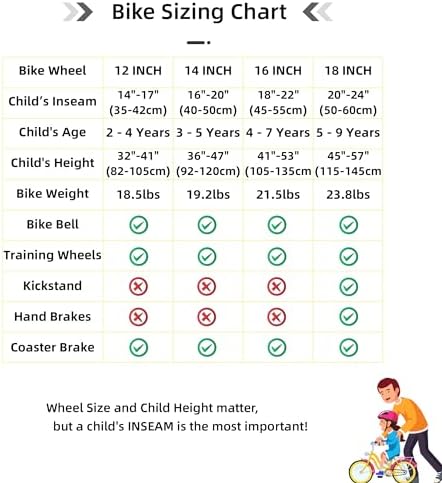 DESIGN FOR KIDS - 1. This Kids bike comes with stable training wheel early rider. 2.Quick release seat simplify the height adjustment. 3.Saddle with holder to learn riding when the training wheel is off. 4.Foot brake suitable for young rider don't have enough power to manipulate the hand brake. MINIMUM MAINTENANCE - Made of premium steel to survive the bumps of learning, the durable steel frame is backed by our limited lifetime warranty. The bike comes with black tire & single speed, only little maintenance needed due to the simple design. DIY DECAL & SAFE CHAIN GURAD - Your child will get a DIY decal, they could make a unique bike with the decal by sticking their name on the frame or chain guard. The chain guard well protects the chain, it will last longer than other bikes, your child will not get hurt when try to touch the chain. EASY TO INSTALL - The children bike comes with 85% Pre-assembled body and the basic assembly tools, only pump needed for tire, normally takes a novice about 20 minutes to assemble it. If you have problem about assembly or the bike, please contact us. RECOMMENDED SIZE CHART - 12" BIKE FOR 2-4 YEARS (33"-41") TODDLER, 14" bike for 3-5 years (35" - 47") child, 16" bike for 4-7 years (41" - 53") boys & girls, 18" bike for 5-9 years (43"-59") boys & girls. Note: child height may vary even at the same age, please take the height into consideration.